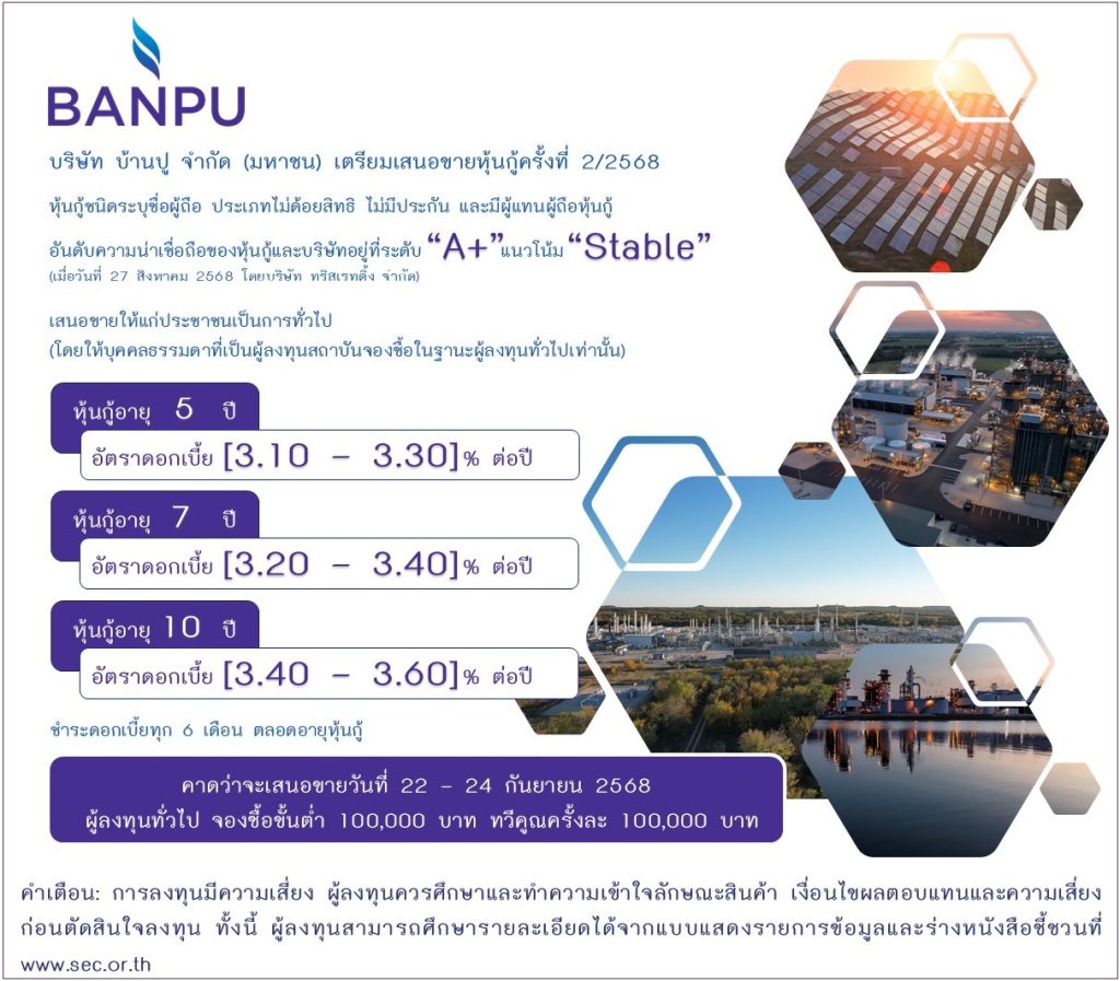 บริษัท บ้านปู (BANPU) ผู้นำด้านพลังงานที่หลากหลาย เตรียมออกและเสนอขายหุ้นกู้ให้แก่ประชาชนเป็นการทั่วไป (Public Offering) จำนวน 3 ชุด ผ่าน 7 สถาบันการเงินชั้นนำ โดยหุ้นกู้ได้รับการจัดอันดับเครดิตจากทริสเรทติ้งที่ระดับ “A+” แนวโน้ม “คงที่” เมื่อวันที่ 27 สิงหาคม พ.ศ. 2568