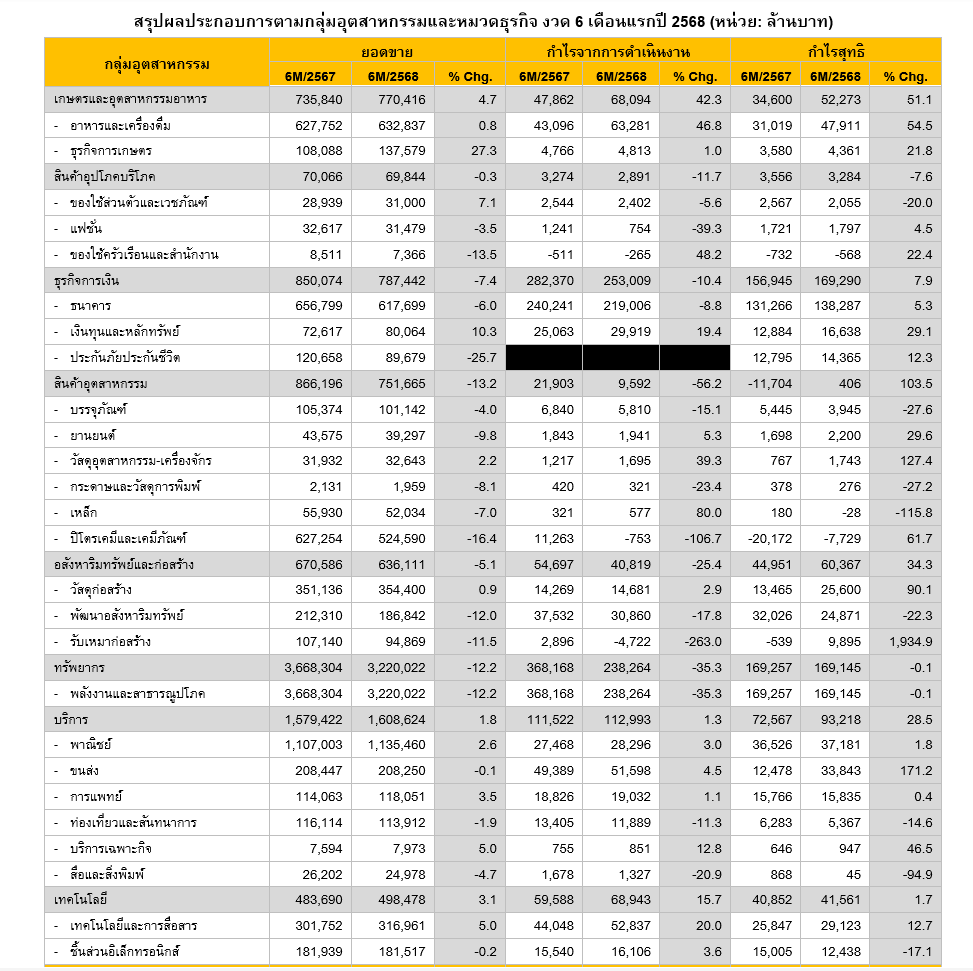 “ภาพรวมครึ่งแรกของปี 2568 บจ. ไทย ที่เติบโตได้ดี ยังคงเกี่ยวข้องกับการอุปโภคบริโภค และการบริการ ได้แก่ 1) หมวดอาหารและเกษตร ซึ่งได้รับผลบวกจากราคาเนื้อสัตว์และอัตรากำไรที่ดีขึ้น รวมถึงราคายางที่ปรับสูงขึ้น 2) หมวดค้าปลีกและโรงพยาบาล ยังคงเติบโตจากยอดการใช้จ่ายในประเทศ และ 3) หมวดโทรคมนาคม ได้รับปัจจัยหนุนจากความต้องการใช้ Data และ Internet เพิ่มตามแนวโน้มการปรับสู่สังคม Digital ที่เติบโต อย่างไรก็ตาม บจ. ไทยยังคงเผชิญความท้าทายจากราคาน้ำมันลดลง ค่าเงินบาทแข็งค่า ซึ่งกระทบ บจ. ในธุรกิจด้านพลังงานและปิโตรเคมีภัณฑ์ และกลุ่มที่มีการขายอ้างอิงสกุลเงินต่างประเทศ จึงทำให้ผลการดำเนินงานรวมชะลอลงจากปีก่อน” นายอัสสเดชกล่าว