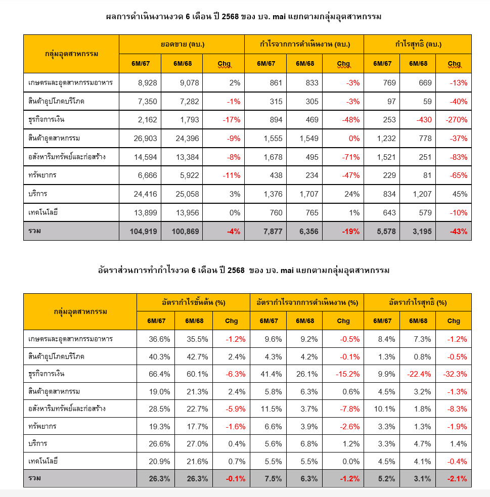 นายประพันธ์ เจริญประวัติ ผู้จัดการตลาดหลักทรัพย์ เอ็ม เอ ไอ (mai) เปิดเผยว่า บริษัทจดทะเบียนใน mai จำนวน 218 บริษัท คิดเป็น 97% จากทั้งหมด 225 บริษัท (ไม่รวมบริษัทในกลุ่มที่เข้าข่ายอาจถูกเพิกถอน หรือ NC และบริษัทที่ปิดงบไม่ตรงงวด) นำส่งผลการดำเนินงาน โดย 6 เดือนแรกของปี 2568 เปรียบเทียบกับปีก่อน มียอดขายรวม 100,869 ล้านบาท ลดลง 3.9% ต้นทุนขาย 74,388 ล้านบาท ลดลง 3.8% กำไรขั้นต้น 26,482 ล้านบาท ลดลง 4.1%