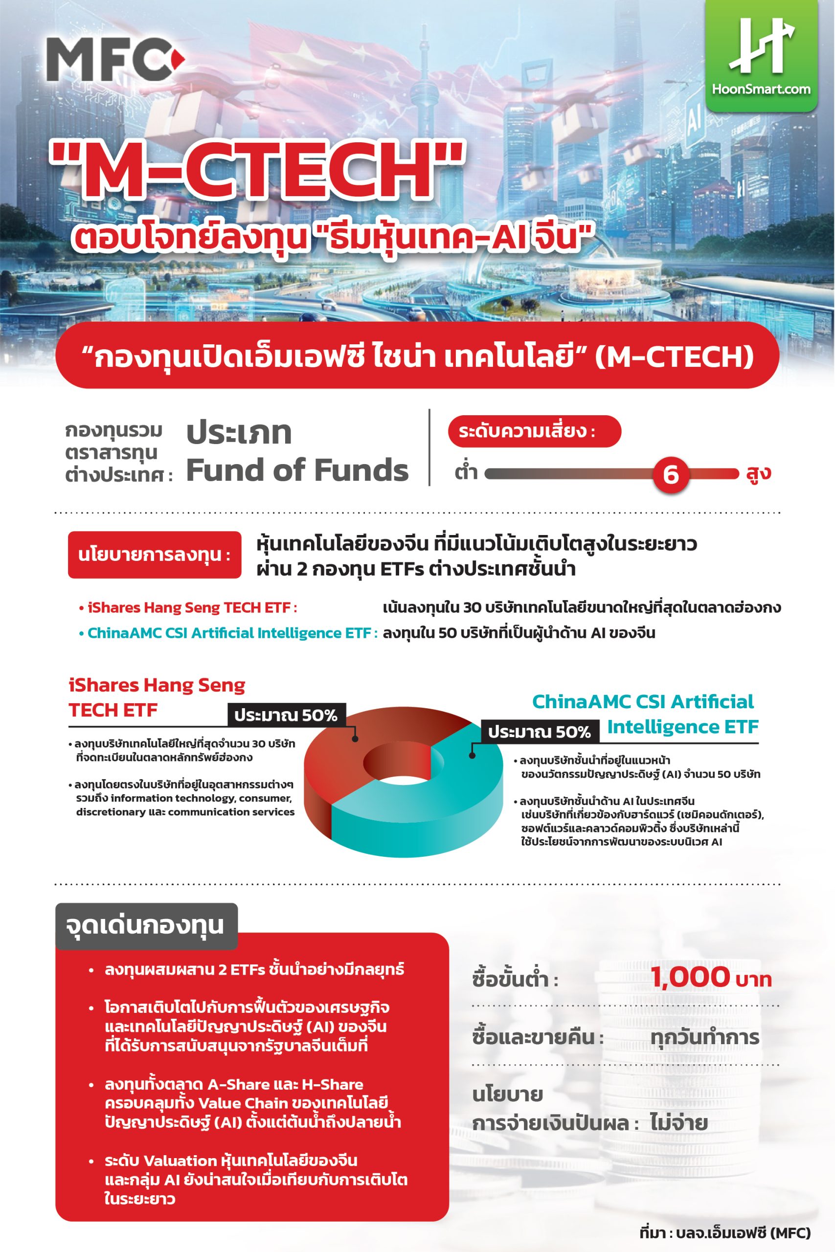 สำหรับกองทุน M-CTECH (ระดับความเสี่ยง 6) มีนโยบายลงทุนใน “กองทุนรวมตราสารทุนต่างประเทศและ/หรือกองทุนรวมอีทีเอฟตราสารทุนต่างประเทศ (ETF) ” ที่มีนโยบายลงทุนในตราสารทุนของบริษัทที่จดทะเบียนจัดตั้งในประเทศจีน หรือบริษัทที่มีการดำเนินธุรกิจในประเทศจีน หรือบริษัทที่มีรายได้หลักจากการประกอบกิจการในประเทศจีน ที่มีการทำธุรกิจหรือได้รับประโยชน์จากธุรกิจที่เกี่ยวข้องกับ เทคโนโลยีหรือนวัตกรรมที่เกี่ยวข้องกับเทคโนโลยี โดยกองทุนจะลงทุนเพื่อให้มี Net Exposure ในกองทุนรวมต่างประเทศโดยเฉลี่ยในรอบปีบัญชีไม่น้อยกว่า 80% ของ NAV และบริษัทหลักทรัพย์จัดการกองทุนเอ็มเอฟซี หรือบลจ.เอ็มเอฟซี (MFC) ซึ่งเป็นผู้บริหารกองทุนจะลงทุนในกองทุนใดกองทุนหนึ่งโดยเฉลี่ยในรอบปีบัญชีไม่เกิน 79% ของ NAV