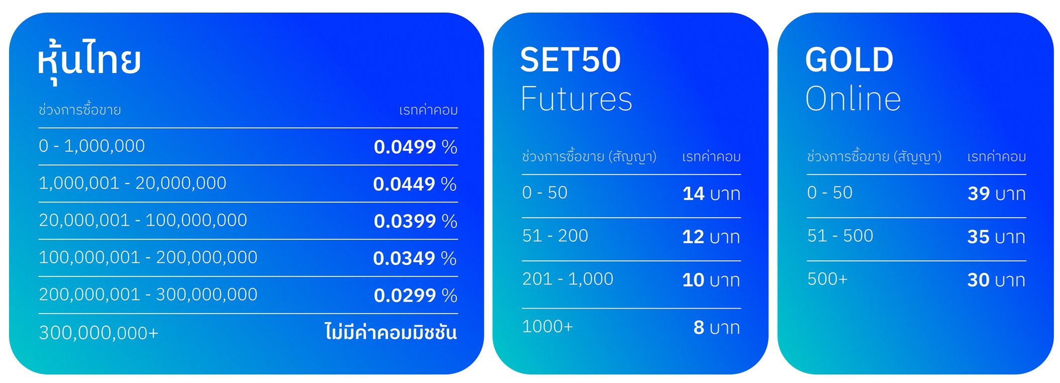 ผู้ใช้บริการจะได้รับโควตาการซื้อขายฟรีทุกเดือน  ทั้งหุ้นไทย 100,000 บาทแรก หุ้นสหรัฐฯ 1,000 ดอลลาร์แรก และ TFEX 5 สัญญาแรก ขณะเดียวกันค่าคอมฯ หุ้นไทยถูกลงจากล้านละ 600 บาท เหลือต่ำสุดล้านละ 299 บาท ลดสูงสุดกว่า 50% ส่วน TFEX เหลือขั้นต่ำเพียงสัญญาละ 8 บาท และ Gold Online ลดเหลือขั้นต่ำสัญญาละ 30 บาท