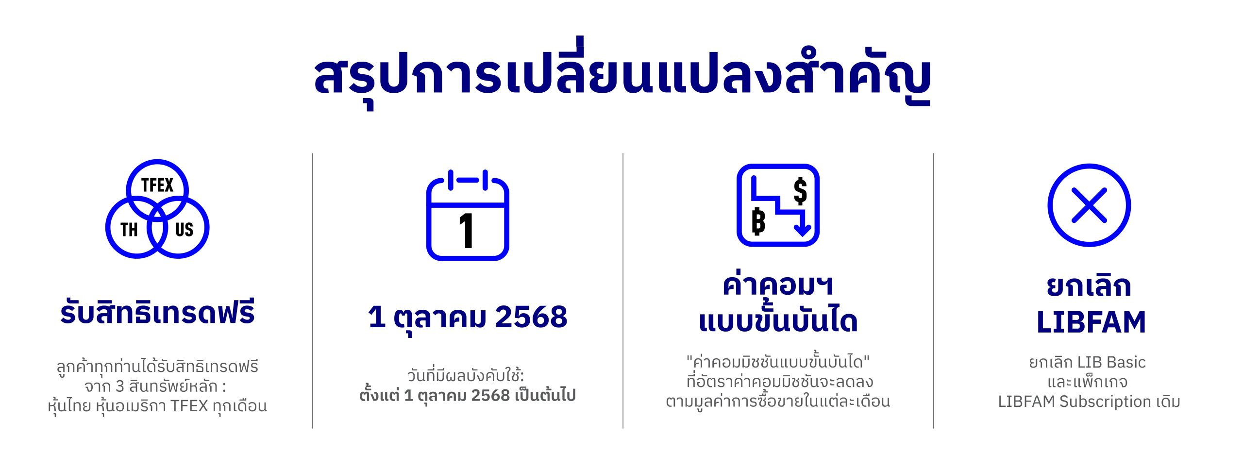 บริษัท หลักทรัพย์ ลิเบอเรเตอร์ (LIBERATOR) เดินหน้ายกระดับบริการนักลงทุน ปรับโครงสร้างค่าคอมมิชชันครั้งสำคัญ และมอบสิทธิพิเศษใหม่ที่ตอบโจทย์ทุกสไตล์การลงทุน มีผลบังคับใช้ตั้งแต่วันที่ 1 ต.ค. 2568 เป็นต้นไป ซึ่งถือเป็นการทดแทนค่าคอมมิชชันเดิม “LIB Basic” และแพ็กเกจ “LIBFAM Subscription”