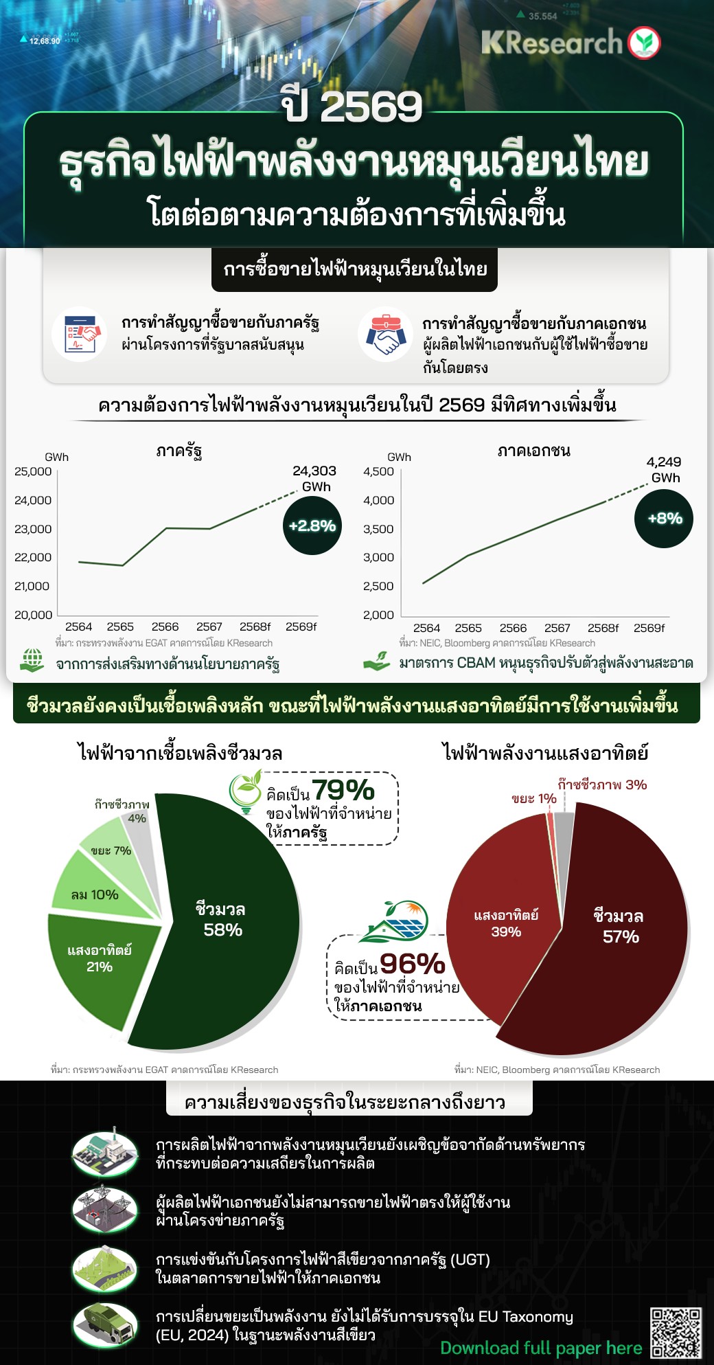 ศูนย์วิจัยกสิกรไทย ระบุว่า ความต้องการใช้ไฟฟ้าจากพลังงานหมุนเวียนของไทยมีแนวโน้มเติบโตต่อเนื่องในปี 2569 ทั้งจากภาครัฐและภาคเอกชน