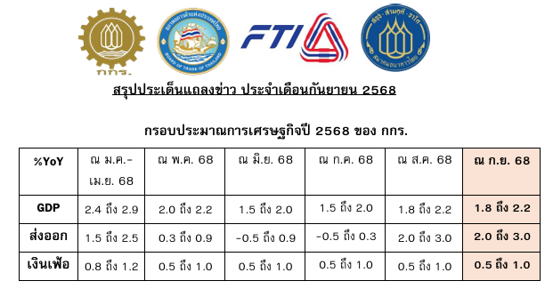 นายผยง ศรีวณิช ประธานกรรมการสมาคมธนาคารไทย เป็นประธานการประชุมคณะกรรมการร่วมภาคเอกชน 3 สถาบัน (กกร.) สรุปผลการประชุมร่วมกับ นายเกรียงไกร เธียรนุกุล ประธานสภาอุตสาหกรรมแห่งประเทศไทย (ส.อ.ท.) และดร.พจน์ อร่ามวัฒนานนท์ ประธานกรรมการสภาหอการค้าแห่งประเทศไทย ว่า กกร.มีความกังวลต่อแนวโน้มเศรษฐกิจไทยในช่วงครึ่งปีหลัง โดยคาดว่าครึ่งปีหลังของปี 2568 เศรษฐกิจมีแนวโน้มขยายตัวเพียงประมาณ 1% และทั้งปี 2568 GDP จะขยายตัว 1.8%-2.2% ปัจจัยกดดันทางเศรษฐกิจเพิ่มขึ้นจากความไม่แน่นอนทางการเมือง ซึ่งอาจกระทบการเบิกจ่ายงบประมาณ รวมถึงการขาดความเชื่อมั่นในการตัดสินใจลงทุนของภาคเอกชนในระยะข้างหน้า และมีความเสี่ยงที่ประเทศจะถูกลดอันดับความน่าเชื่อถือสูงขึ้น