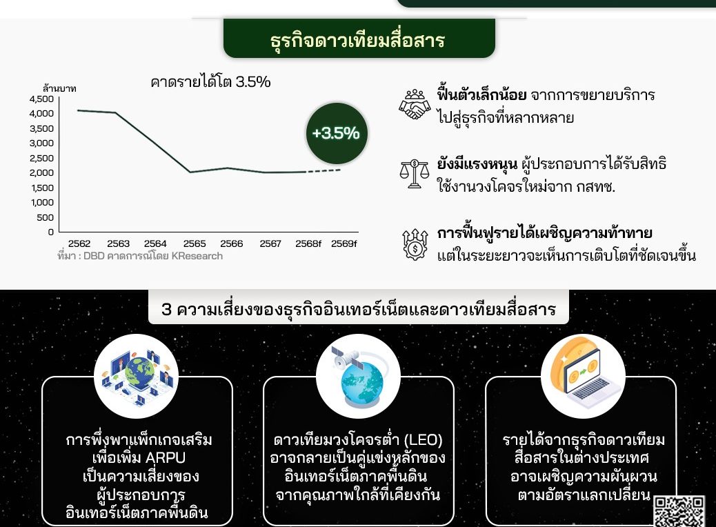 HoonSmart.com>>ศูนย์วิจัยกสิกรไทย คาดรายได้ธุรกิจอินเทอร์เน็ตภาคพื้นดิน ปี 2569 โต 3.4% จากการขยายตัวของตลาด B2C และ B2B พุ่งแรง ด้านธุรกิจดาวเทียมสื่อสาร รายได้โต 3.5% จากสิทธิใช้วงโคจรใหม่ และความคืบหน้าประมูลโครงการ USO 3 สร้างโอกาสการลงทุนในโครงสร้างพื้นฐานดิจิทัล หนุนหุ้นกลุ่ม ICT เด่น ADVANC,GULF,INTUCH,THCOM กินรวบ TRUE ร่วมแบ่งเค้ก
