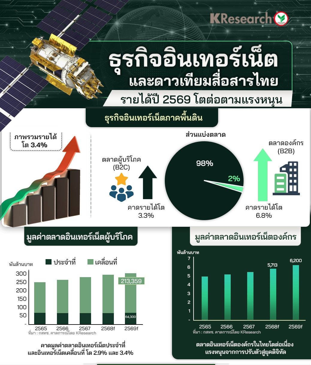 ศูนย์วิจัยกสิกรไทย ระบุว่า ปี 2569 รายได้จากธุรกิจอินเทอร์เน็ตภาคพื้นดินคาดว่าจะขยายตัว 3.4% ธุรกิจอินเทอร์เน็ตภาคพื้นดินในไทยมี 2 ตลาดหลัก ได้แก่ ตลาดผู้บริโภค (B2C) ซึ่งมีส่วนแบ่งตลาดกว่า 98% และตลาดองค์กร (B2B) ที่มีส่วนแบ่ง 2%