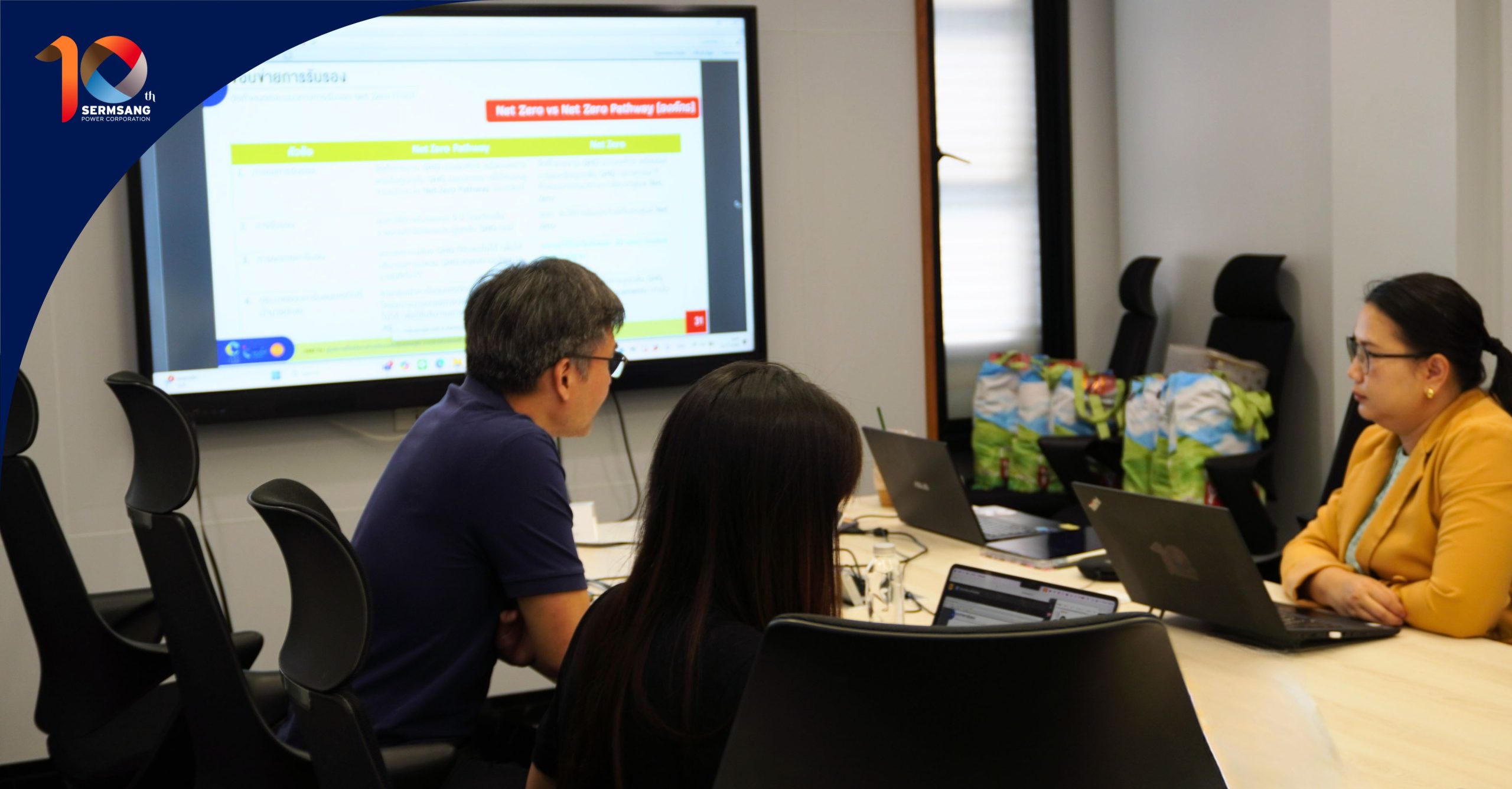 นางสาวสุดารัตน์ มีชัย ESG & Sustainability Manager และ นางสาวนีรนารา สุขลังการ Senior Corporate Communication Officer บริษัท เสริมสร้าง พาวเวอร์ คอร์ปอเรชั่น (SSP) ให้การต้อนรับ นายจิรวัตร จิรจริยาเวช และนางสาวพิชชาพร ทองสีเหลือง ผู้เชี่ยวชาญเฉพาะด้านพลังงานเชิงนิเวศ (Center of Excellence for Eco-Energy: CEEE) ภาควิชาวิศวกรรมเคมี คณะวิศวกรรมศาสตร์ มหาวิทยาลัยธรรมศาสตร์ เพื่อให้คำปรึกษาเชิงลึกภายใต้โครงการ CALO ในการถ่ายทอดความรู้เชิงเทคนิค วิเคราะห์โครงสร้างองค์กร วางแนวทางจัดทำบัญชีคาร์บอนองค์กร (Carbon Footprint of Organization: CFO) และวางรากฐานการกำหนดเป้าหมายลดการปล่อยก๊าซเรือนกระจกในอนาคตอย่างมีประสิทธิภาพ โดยมีผู้เข้าร่วมกิจกรรมจากกลุ่มบริษัทฯจำนวน 18 คน จากสายงานต่าง ๆ ได้แก่ สายบริหารองค์กรและสนับสนุน, สายงานปฏิบัติการและบำรุงรักษา และสายงานวิศวกรรมและบริหารโรงไฟฟ้า เพื่อร่วมวางแนวทางที่สามารถต่อยอดไปสู่การกำหนดเป้าหมาย การลดคาร์บอนที่สามารถตรวจสอบได้และวัดผลได้จริง