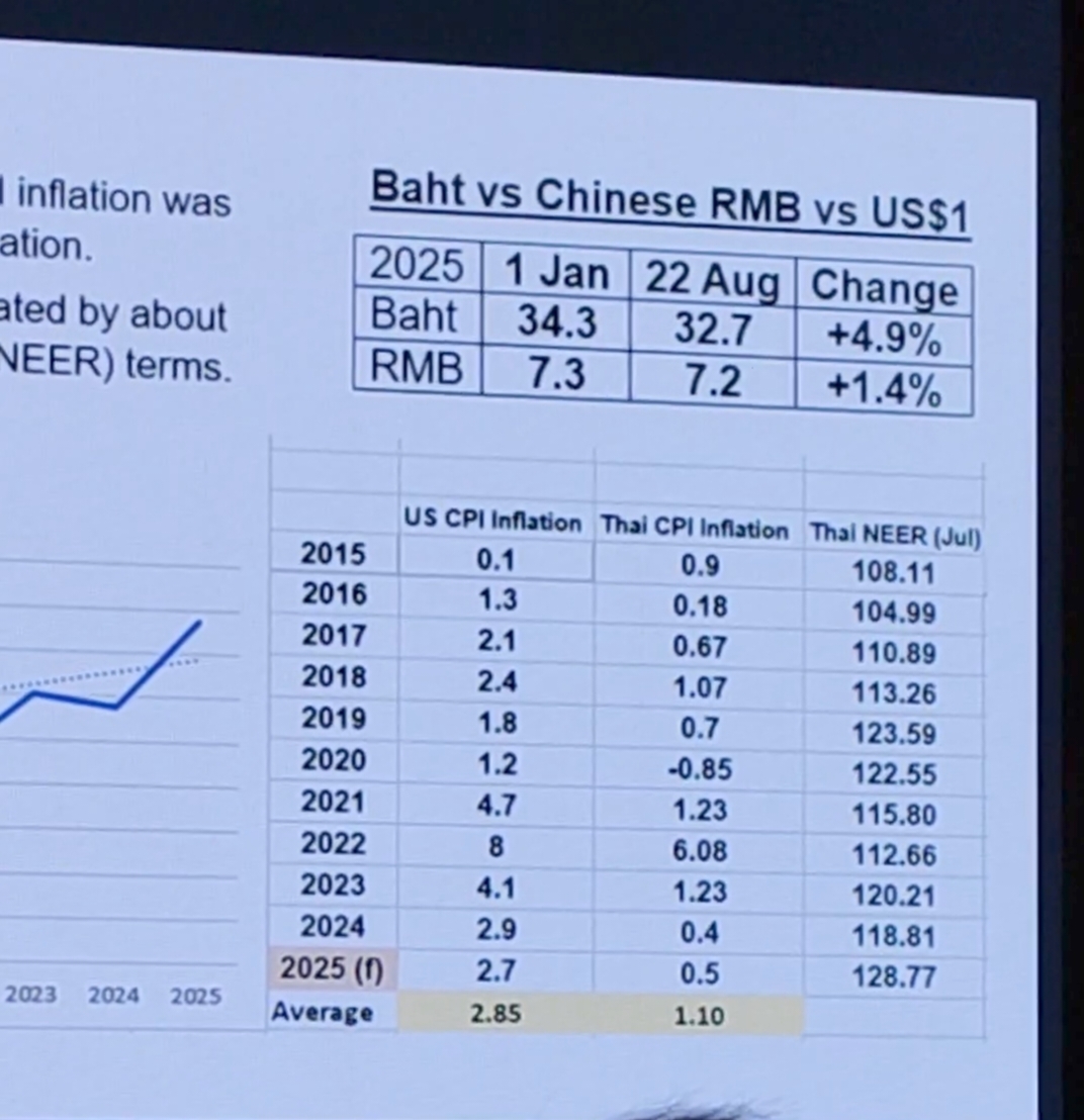 2.ค่าบาทแข็ง โดยตั้งแต่วัน 1 ม.ค.2568 ถึงวันที่ 9 ก.ย.2568 บาทแข็ง 7% เทียบกับเงินภูมิภาคนี้ที่แข็งค่า 2% กว่า ทำให้ผู้ประกอบการไทยเหนื่อย ซึ่งไม่ใช่เพิ่งเกิด แต่เงินบาทไทยแข็งค่าขึ้นเฉลี่ยปีละ 2% ในช่วง 10 ปีที่ผ่านมา ทั้งๆ ที่เงินเฟ้อไทยต่ำกว่าสหรัฐฯ 2%