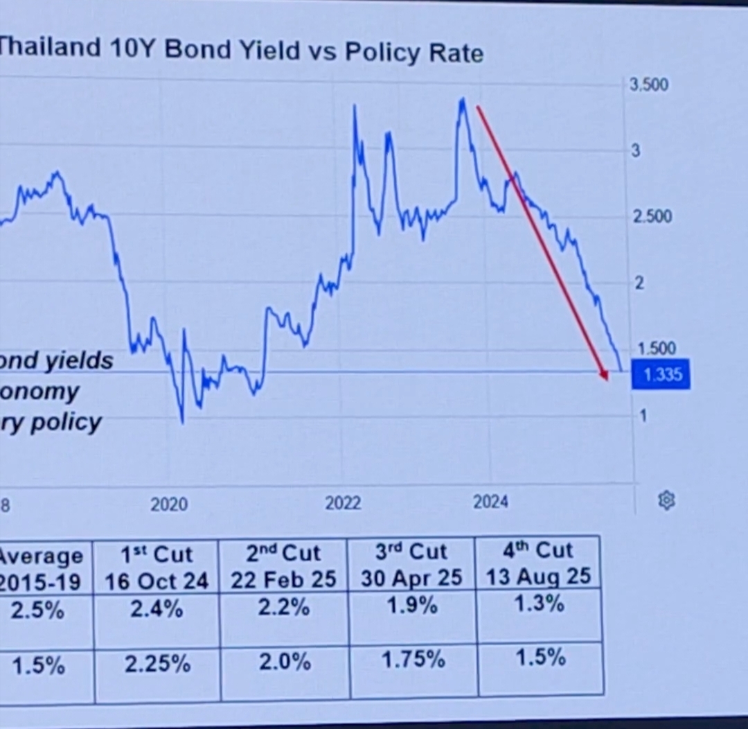 “แต่ปัญหาคือขอพูดตรงๆนะ 10 ปีที่ผ่านมาเงินเฟ้อไทยเฉลี่ย 1% กว่าไม่ถึง 2% อเมริกาเขาเฉลี่ย 2% กว่า นักเศรษฐศาสตร์มองว่าในระยะยาวเงินมีการเสื่อมค่าเท่าๆกันต่อปี ประเทศไหนเงินเฟ้อต่ำ ค่าเงินก็จะต้องแข็ง แค่ขอให้ทำให้เงินเฟ้อกลับมาที่ 2% ให้ได้ แต่ทางแบงก์ชาติ บอกว่าเราวัดเงินเฟ้อผิด แต่ตัวเลขมันฟ้อง ทำให้ธุรกิจทำงานลำบาก จะเห็นว่าอัตราผลตอบแทนพันธบัตรอายุ 10 ปี มีการปรับลงอย่างรุนแรง พอๆ กับอัตราดอกเบี้ยนโยบายซึ่งเป็นการสะท้อนว่าเศรษฐกิจไทยร่วงแรง ต้องจัดการเรื่องนโยบายการเงิน”ดี.ศุภวุฒิ กล่าว