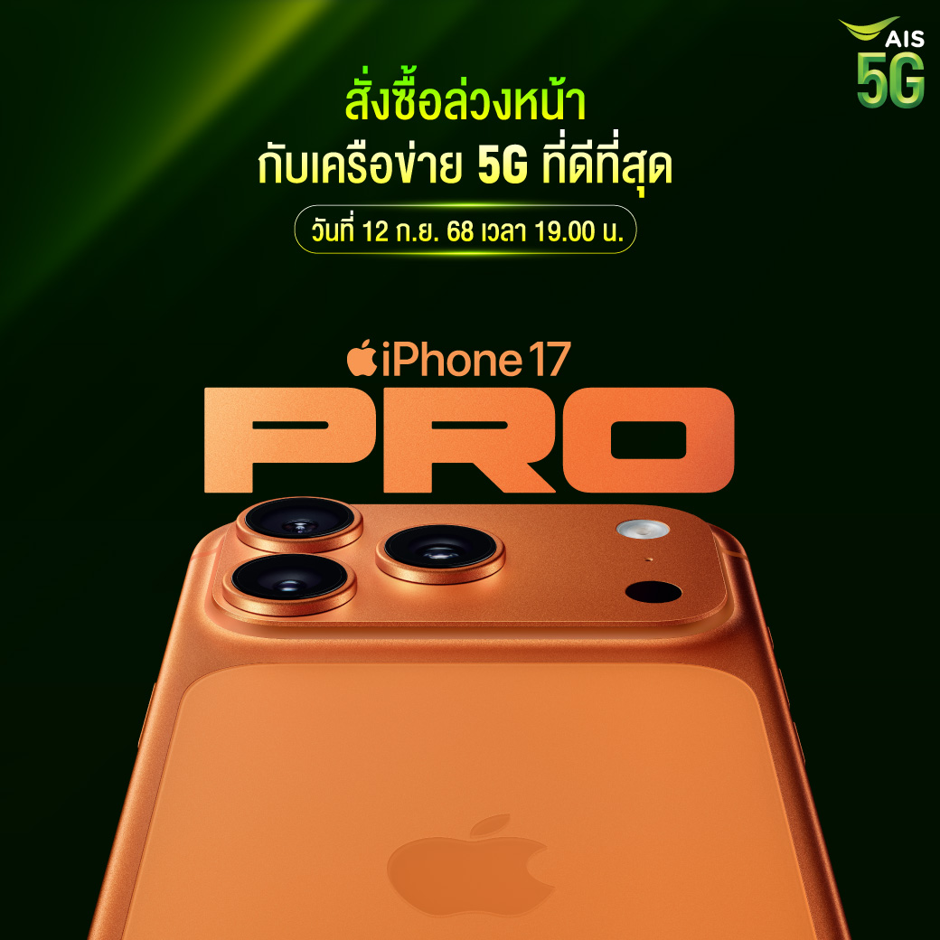 HoonSmart.com >> AIS 5G เปิดตัว iPhone 17 เปิดจองล่วงหน้า iPhone 17, iPhone Air, iPhone 17 Pro และ iPhone 17 Pro Max ตั้งแต่วันศุกร์ที่ 12 กันยายน 2568 เวลา 19.00 น. และพร้อมจำหน่ายศุกร์ 19 ก.ย.นี้ทั่วประเทศ