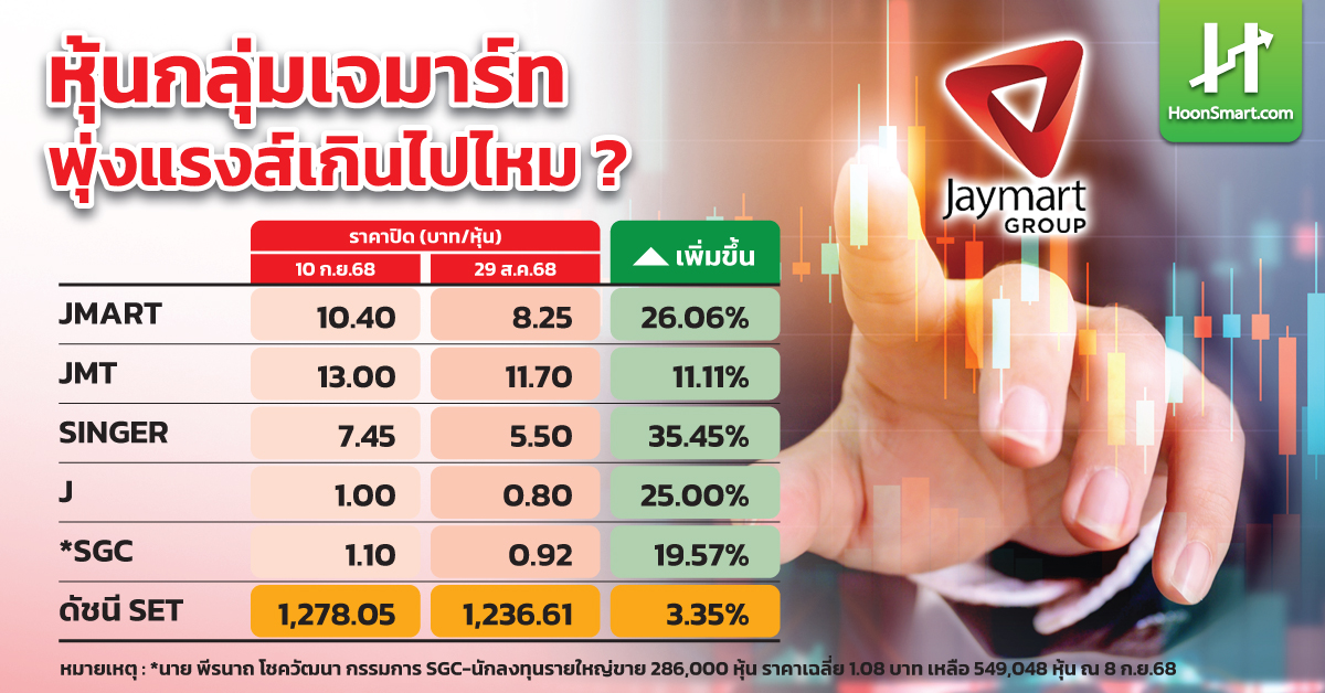 ทั้งนี้ ในเดือนก.ย. 2568 หุ้นกลุ่มเจมาร์ทพุ่งขึ้นแรงมากกว่า 10-20% นำหน้าตลาดหุ้นโดยรวมที่บวก 3.35% ดัชนี SET ปิดที่ 1,278.05 จุด ณ วันที่ 10 ก.ย. 2568 นอกจากกำไรฟื้นตัวขึ้นในไตรมาส 2 ที่ผ่านมา ยังมีข่าวดีจากดอกเบี้ยไทยลดลง รวมถึงแนวโน้มดอกเบี้ยสหรัฐจะปรับตัวลงในเดือนก.ย. และนโยบายกระตุ้นเศรษฐกิจของรัฐบาล”อนุทิน” นำโครงการ”คนละครึ่ง”กลับมาใหม่ และลดค่าครองชีพให้แก่ประชาชน นับเป็นปัจจัยหนุนธุรดิจของกลุ่มเจมาร์ท