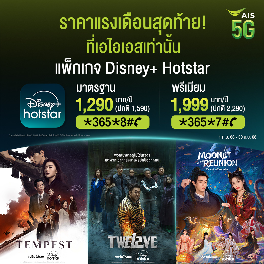 AIS จัดเต็มความบันเทิงส่งท้ายเดือนสุดท้ายของโปรโมชัน ให้ลูกค้าสมัครแพ็กเกจรายปี Disney+ Hotstar ในราคาสุดคุ้ม ถึงวันที่ 30 กันยายน 2568 เท่านั้น ดื่มด่ำความบันเทิงระดับโลกแบบจัดเต็ม กับคอนเทนต์คุณภาพจาก Disney, Pixar, Marvel, Star Wars, National Geographic และอีกมากมาย ทั้งภาพยนตร์ ซีรีส์ และสารคดีสุดฮิต บนเครือข่ายที่ดีที่สุด AIS 5G ตอกย้ำความเป็นผู้นำด้านความบันเทิงที่ครบครันที่สุดในประเทศไทย