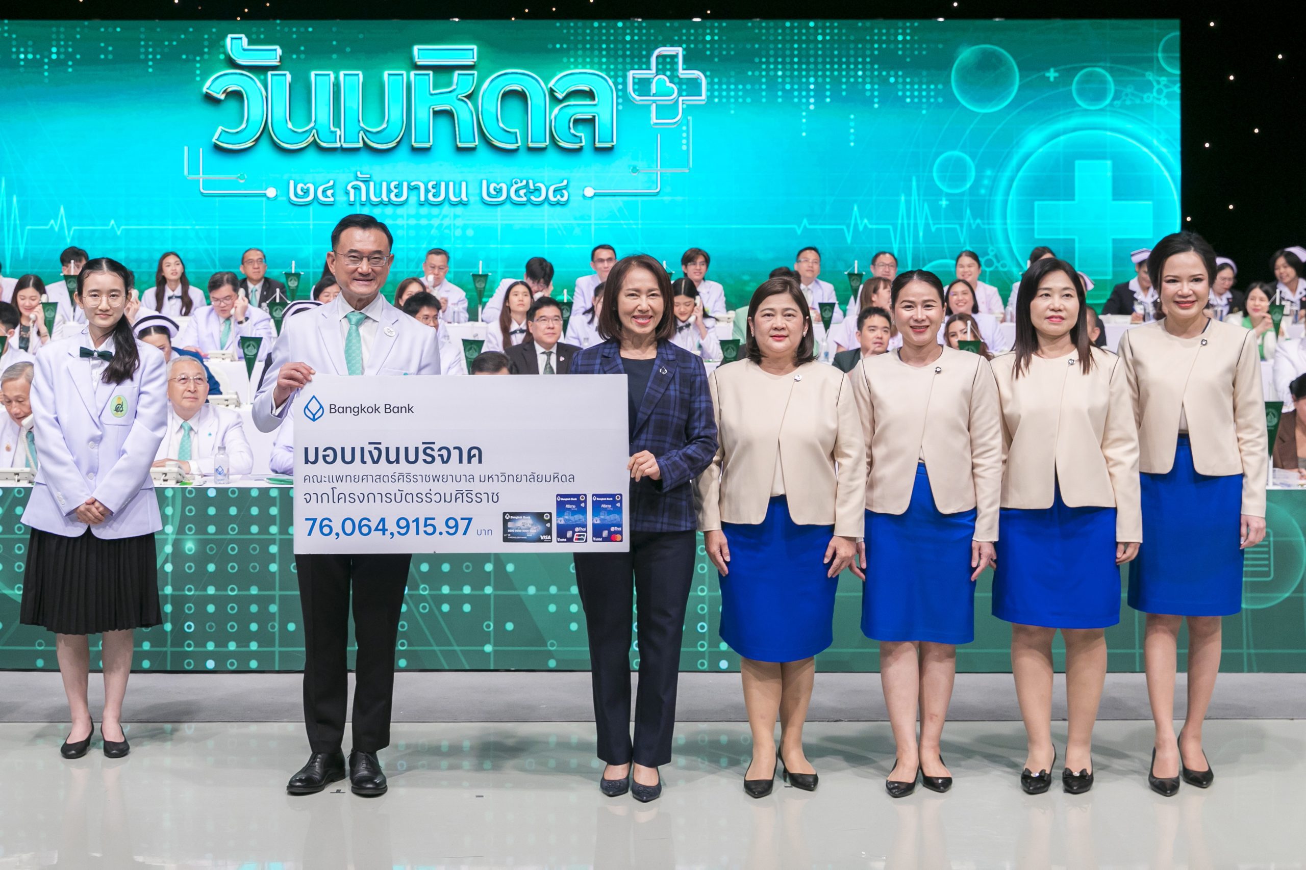 นางสาวพจณี คงคาลัย ผู้ช่วยผู้จัดการใหญ่ บริหารความสัมพันธ์และการขาย (ที่ 5 จากขวา) นางรัตตพร ฉายาสิริวงศ์ เจ้าหน้าที่บริหารระดับ Vice President สนับสนุนระบบงานพิธีการอิเล็กทรอนิกส์ (ที่ 2 จากขวา) นางศิริกุล ไชยสิงห์ ผู้จัดการภาคนครหลวง 3 (ที่ 4 จากขวา) นางสาวนริสา เหล่าพานิช ผู้จัดการสาขาสะพานพระปิ่นเกล้า (ขวาสุด) ธนาคารกรุงเทพ จำกัด (มหาชน) ในฐานะผู้แทนธนาคารส่งมอบเงินบริจาค จำนวน 76,064,915.97 บาท ที่มาจาก “โครงการบัตรร่วมศิริราช ธนาคารกรุงเทพ” ที่ผู้ถือบัตรเป็น “ผู้ให้” สร้างคุณประโยชน์ทางการแพทย์ในทุกยอดการใช้จ่าย ระหว่างวันที่ 1 กันยายน 2567 – 31 สิงหาคม 2568 แก่ ศาสตราจารย์ นายแพทย์อภิชาติ อัศวมงคลกุล คณบดี คณะแพทยศาสตร์ศิริราชพยาบาล มหาวิทยาลัยมหิดล (ซ้ายสุด) ในงาน “วันมหิดล” เพื่อสมทบทุนช่วยผู้ป่วยด้อยโอกาส จัดซื้ออุปกรณ์ทางการแพทย์และพัฒนาศูนย์ความเป็นเลิศทางการแพทย์ศิริราช และรำลึกถึงพระมหากรุณาธิกรุณาธิคุณของสมเด็จพระมหิตลาธิเบศร อดุลยเดชวิกรม พระบรมราชชนก “พระบิดาแห่งการแพทย์แผนปัจจุบันของไทย” สำหรับ “โครงการบัตรร่วมศิริราช ธนาคารกรุงเทพ” เพียงลูกค้าใช้จ่ายผ่านบัตร ‘บัตรบีเฟิสต์ สมาร์ท ทีพีเอ็น ศิริราช’ หรือ ‘บัตรเครดิตวีซ่า แพลทินัม ศิริราช ธนาคารกรุงเทพ’ ธนาคารกรุงเทพจะสมทบให้ศิริราช 0.2% ของยอดการใช้จ่ายในแต่ละรอบบัญชี และทุกการสมัครบัตรใหม่ ‘บัตรบีเฟิสต์ สมาร์ท ทีพีเอ็น ศิริราช’ ธนาคารร่วมบริจาค 100 บาท และค่าธรรมเนียมรายปี ทุกปีต่อไป ธนาคารจะร่วมบริจาค 50 บาท