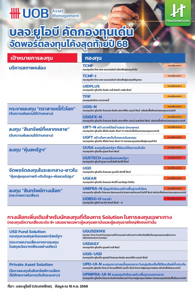 – เพื่อโอกาสสร้างผลตอบแทนที่สม่ำเสมอ : กองทุนเปิด ยูไนเต็ด ซีไอโอ อินคัม ฟันด์ TH หน่วยลงทุนชนิดรับซื้อคืนหน่วยลงทุนแบบปกติ (UIFT-N) ระดับความเสี่ยง 5 (เสี่ยงปานกลางค่อนข้างสูง) ที่มีนโยบายเน้นลงทุนในกองทุนหลัก United CIO Income Fund – Class T USD Acc เพียงกองทุนเดียว โดยเฉลี่ยในรอบปีบัญชีไม่น้อยกว่าร้อยละ 80 ของมูลค่าทรัพย์สินสุทธิของกองทุน ซึ่งกองทุนหลักกระจายการลงทุนไปในสินทรัพย์ทั่วโลก