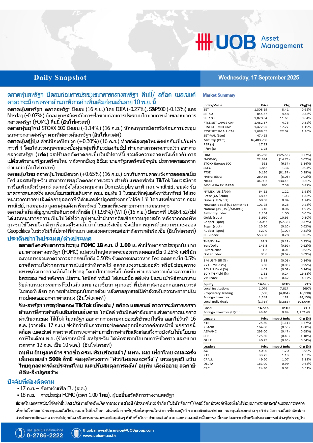 UOBAM : ตลาดหุ้นสหรัฐฯ ปิดลบก่อนประชุมธนาคารกลางสหรัฐฯคืนนี้ 17/09/2025 09:2917/09/2025 09:31009Breaking News, Fund Manager HoonSmart.com>> UOBAM Daily Snapshot : ตลาดหุ้นสหรัฐฯ ปิดลบก่อนการประชุมธนาคารกลางสหรัฐฯ คืนนี้/ สก็อต เบสเซนต์ คาดว่าจะมีการเจรจาด้านภาษีการค้าเพิ่มเติมก่อนเส้นตาย 10 พ.ย.นี้ ———————————————————————————————————————————————————– Facebook iconFacebookTwitter iconTwitterLINE iconLine