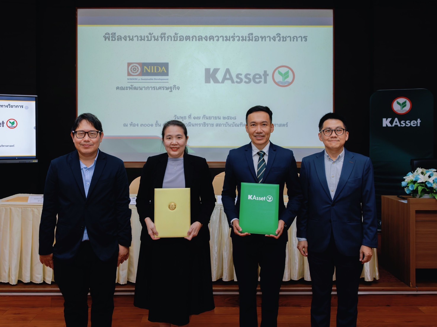 บริษัทหลักทรัพย์จัดการกองทุน (บลจ.) กสิกรไทย จำกัด และสถาบันบัณฑิตพัฒนบริหารศาสตร์ โดยคณะพัฒนาการเศรษฐกิจ (นิด้า) ได้ร่วมลงนามในบันทึกข้อตกลงความร่วมมือทางวิชาการ เพื่อส่งเสริมการพัฒนาความรู้ทางวิชาการด้านการเงิน การลงทุน และการบริหารความเสี่ยงอย่างยั่งยืน โดยมีเป้าหมายที่จะสร้างองค์ความรู้ร่วมกันระหว่างภาคการเงินและภาคการศึกษา พัฒนาหลักสูตรหรือกิจกรรมที่ตอบโจทย์การพัฒนาที่ยั่งยืน เสริมสร้างประสบการณ์นักศึกษาภายใต้โครงงานวิศวกรรมการเงิน ส่งเสริมการวิจัยและการแลกเปลี่ยนองค์ความรู้ระหว่างนักวิชาการและผู้เชี่ยวชาญด้านการลงทุน พร้อมสร้างเครือข่ายความสัมพันธ์ระหว่าง บลจ.กสิกรไทย และสถาบันการศึกษา โดยได้รับเกียรติจาก รองศาสตราจารย์ ดร.ปริยดา สุขเจริญสิน (ที่ 2 จากซ้าย) คณบดีคณะพัฒนาการเศรษฐกิจ นิด้า และ นายวิน พรหมแพทย์, CFA (ที่ 2 จากขวา) ประธานกรรมการบริหาร บลจ.กสิกรไทย เป็นผู้แทนร่วมลงนาม ณ อาคารนวมินทราธิราช นิด้า เมื่อเร็ว ๆ นี้