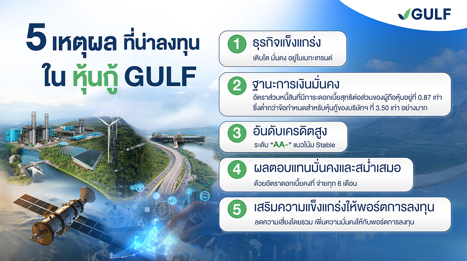 นอกจากนี้ หุ้นกู้ GULF ยังมีอันดับความน่าเชื่อถือที่ระดับ “AA-” แนวโน้ม “คงที่” (Stable) จัดอันดับโดยบริษัท ทริสเรทติ้ง จำกัด โดยทริสระบุว่า อันดับเครดิตดังกล่าวสะท้อนสถานะความเป็นผู้นำของบริษัทฯ ในธุรกิจผลิตไฟฟ้าภายในประเทศ รวมถึงการลงทุนในโครงการโรงไฟฟ้าขนาดใหญ่ที่มีการกระจายตัวดี และความสามารถในการสร้างกระแสเงินสดที่มั่นคงจากการมีสัญญาซื้อขายไฟระยะยาวจากทางภาครัฐ นอกจากนี้ การพิจารณาอันดับเครดิตยังคำนึงถึงรายได้จากเงินปันผล และส่วนแบ่งกำไรจำนวนมากที่บริษัทฯ ได้รับจากการลงทุนในหลายกิจการ โดยเฉพาะจากบริษัท แอดวานซ์ อินโฟร์ เซอร์วิส จำกัด (มหาชน) (ADVANC) ทั้งนี้ อันดับเครดิตดังกล่าวทำให้หุ้นกู้ GULF เป็นหุ้นกู้ที่มีศักยภาพในการชำระหนี้สูง รวมถึงให้ผลตอบแทนสม่ำเสมอ ด้วยอัตราดอกเบี้ยคงที่ โดยกำหนดจ่ายดอกเบี้ยทุกๆ 6 เดือน