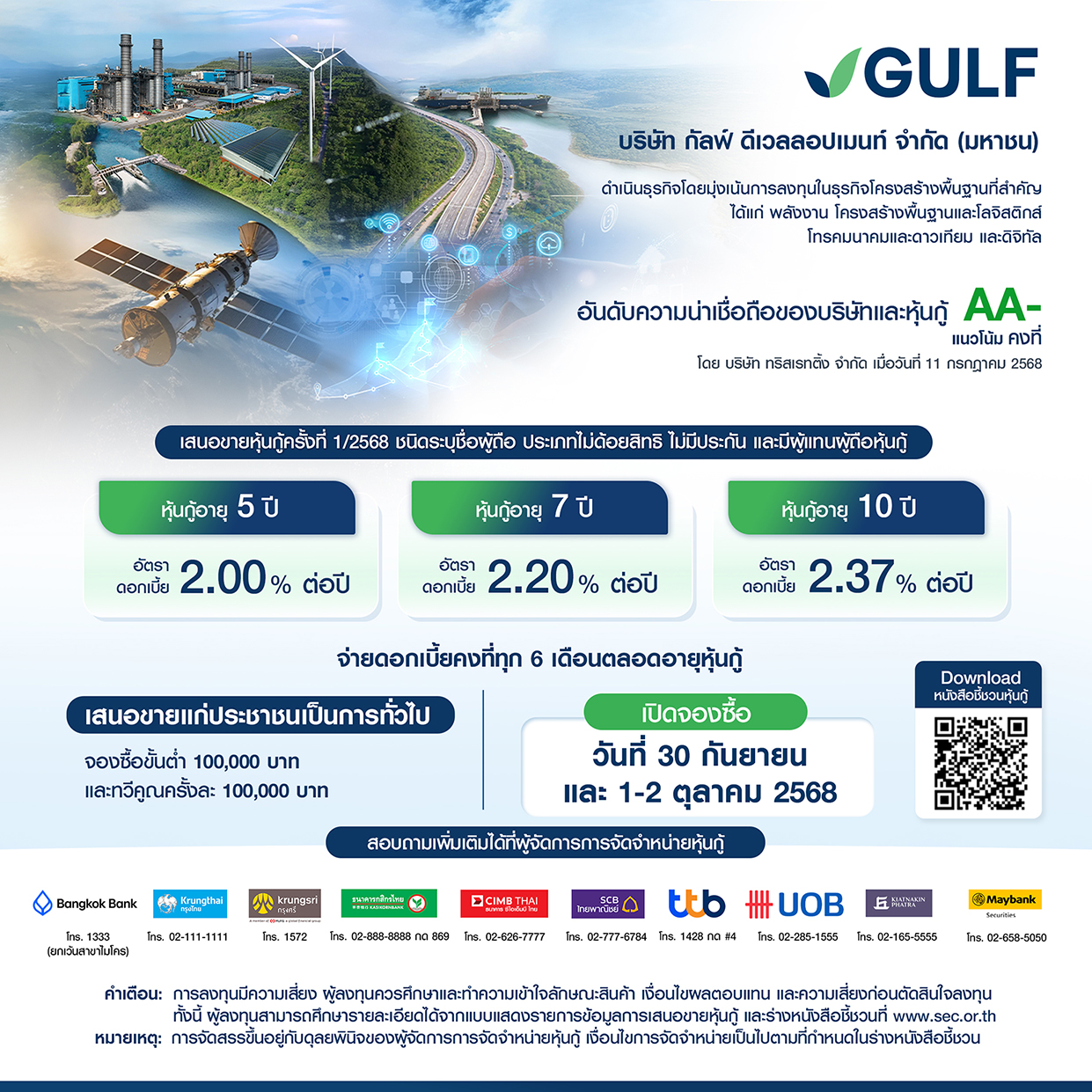 GULF เสนอขายหุ้นกู้ในระหว่างวันที่ 30 กันยายน และวันที่ 1-2 ตุลาคม 2568 โดยผู้ที่สนใจจองซื้อสามารถศึกษารายละเอียดเพิ่มเติมจากหนังสือชี้ชวนการเสนอขายหุ้นกู้ได้ที่ www.sec.or.th หรือสอบถามผู้จัดการการจัดจำหน่ายหุ้นกู้ ดังต่อไปนี้