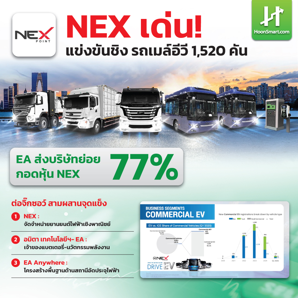 “งานนี้ EA ได้ประโยชน์สูงสุดหลายเด้ง จากการส่งบริษัทย่อยคือ บริษัท อีเอ โมบิลิตี โฮลดิง เข้าไปถือหุ้น NEX มากถึง 77% และเมื่อไตรมาสที่ 2 ที่ผ่านมา ได้ซื้อหุ้นเพิ่มทุน ราคาหุ้นละ 1 บาท จึงไม่แปลกใจที่ราคาหุ้นของทั้งกลุ่มปรับตัวขึ้นแรงอย่างต่อเนื่อง รับข่าว ขสมก.จัดประมูลรถเมล์อีวีงวดแรก 1,520 คัน และเตรียมประมูลอีกรอบ จำนวน 1,500 คัน รายได้และกำไรที่จะเข้ามาล็อตใหญ่พลิกฟื้นภาพกลุ่ม EA เทิร์นอะราวด์ครั้งใหญ่ และมีเงินชำระหนี้หุ้นกู้ ได้รับการเพิ่มอันดับเครดิตได้สูงกว่าลงทุนได้ ช่วยลดภาระต้นทุนทางการเงินลงระยะยาว”