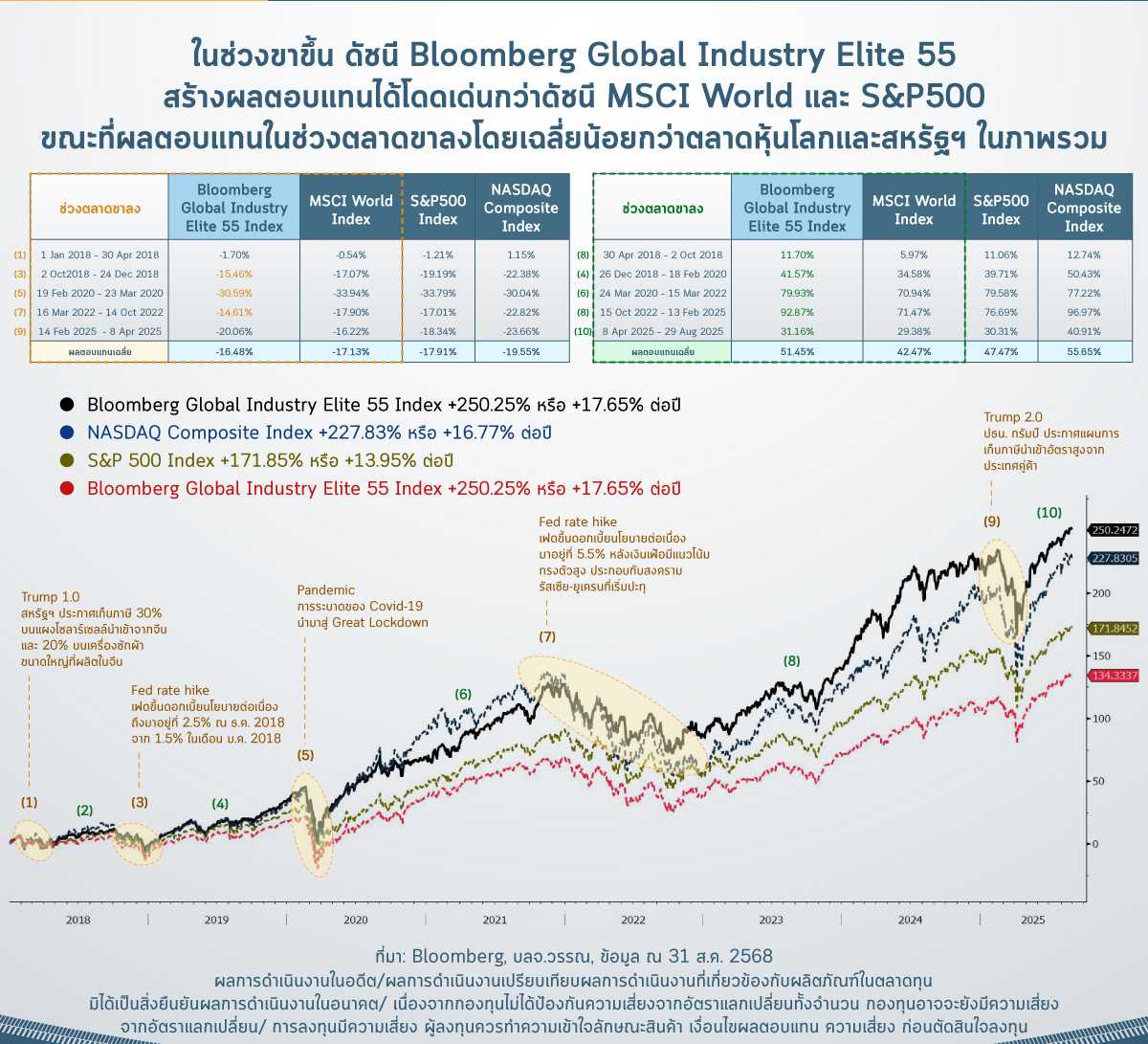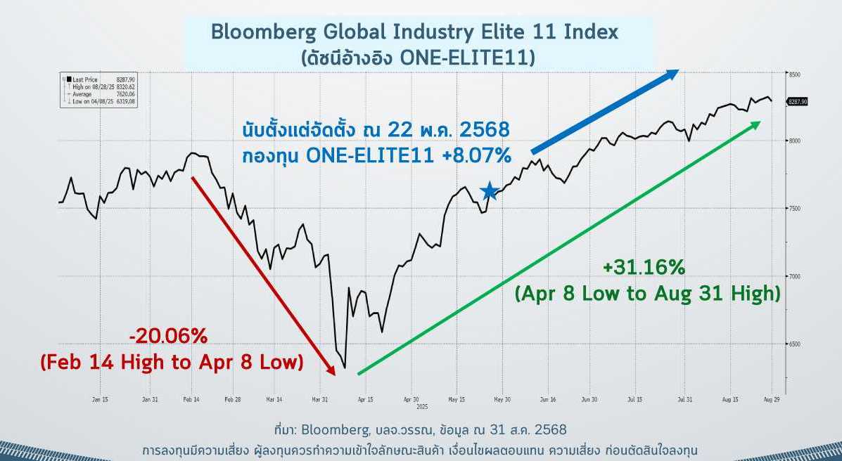 - ในช่วงตลาดขาขึ้นรอบล่าสุด ดัชนี Bloomberg Global Industry Elite 55 (ดัชนีอ้างอิงของกองทุน ONE-ELITE11) ปรับตัวเพิ่มขึ้น +31.96% ชนะดัชนี S&P500 เพิ่มขึ้น +32.94% และ MSCI World +30.76% นับตั้งแต่จุดต่ำสุด ณ 8 เม.ย.2568 โดยดัชนีอ้างอิงปรับตัวเพิ่มขึ้นโดดเด่นต่อเนื่องมาอยู่ที่ 8,338.66 จุด ห่างจากระดับสูงสุดเดิมเพียง 0.07% เป็นไปในทิศทางเดียวกับตลาดหุ้นสหรัฐฯ ที่เพิ่มขึ้นทำจุดสูงสุดใหม่อย่างต่อเนื่อง (ณ 11 ก.ย.2568) (ผลการดำเนินงานในอดีต/ผลการดำเนินงานเปรียบเทียบผลการดำเนินงานที่เกี่ยวข้องกับผลิตภัณฑ์ในตลาดทุน มิได้เป็นสิ่งยืนยันผลการดำเนินงานในอนาคต)