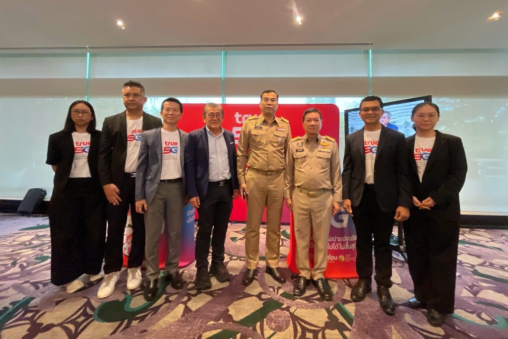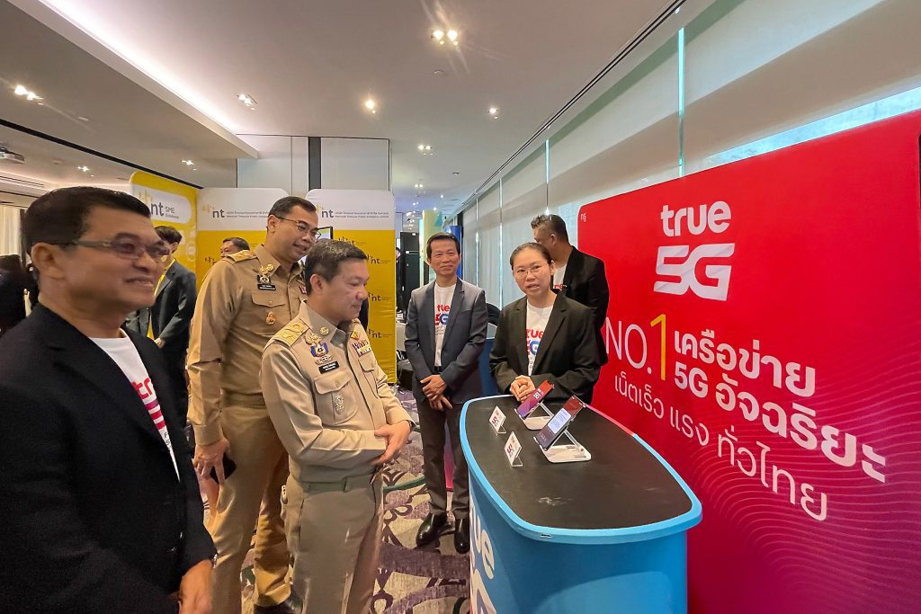 นายอรรษิษฐ์ สัมพันธรัตน์ (ที่ 6 จากซ้าย) ปลัดกระทรวงมหาดไทย และนายเชษฐา โมสิกรัตน์ (ที่ 5 จากซ้าย) อธิบดีกรมป้องกันและบรรเทาสาธารณภัย เยี่ยมชมบูธทรู คอร์ปอเรชั่น ในการประชุมสัมมนาและประชาสัมพันธ์ระบบการแจ้งเตือนภัย “T-Alert” ซึ่งนำเสนอระบบแจ้งเตือนภัย Cell Broadcast Service ผ่านมือถือ และการเตรียมทดสอบการแจ้งเตือนภัยผ่าน True ID สำหรับผู้ชมทีวีออนไลน์ โดยมีนายนฤพนธ์ รัตนสมาหาร (ที่ 7 จากซ้าย) หัวหน้าสายงานรัฐกิจสัมพันธ์และกำกับดูแล บริษัท ทรู คอร์ปอเรชั่น จำกัด (มหาชน) และทีมทรู ให้การต้อนรับและให้ข้อมูลการสนับสนุนเพื่อปกป้องความปลอดภัยของประชาชน