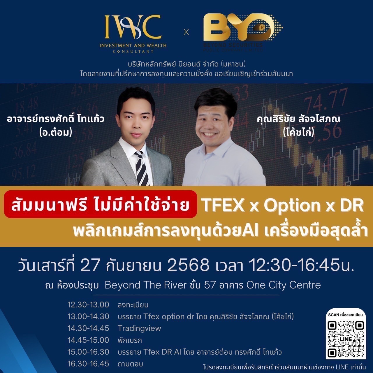 @@@ อิเจ๊ ! มีข่าวดีมาบอก สัมมนาฟรี และดี มีความรู้ มีที่ บล.บียอนด์ (BYD) ร่วมกับ IWC จัดให้ความรู้ ตลาดฟิวเจอร์-ออฟชั่น ที่จะมาพลิกเกมลงทุนด้วย AI โดยโค้ชผู้เชี่ยวชาย “อ.ต๋อม” และ “โค้ชไก่” วันเสาร์ที่ 27 ก.ย.นี้ สแกนลงทะเบียนข้างล่างนี้