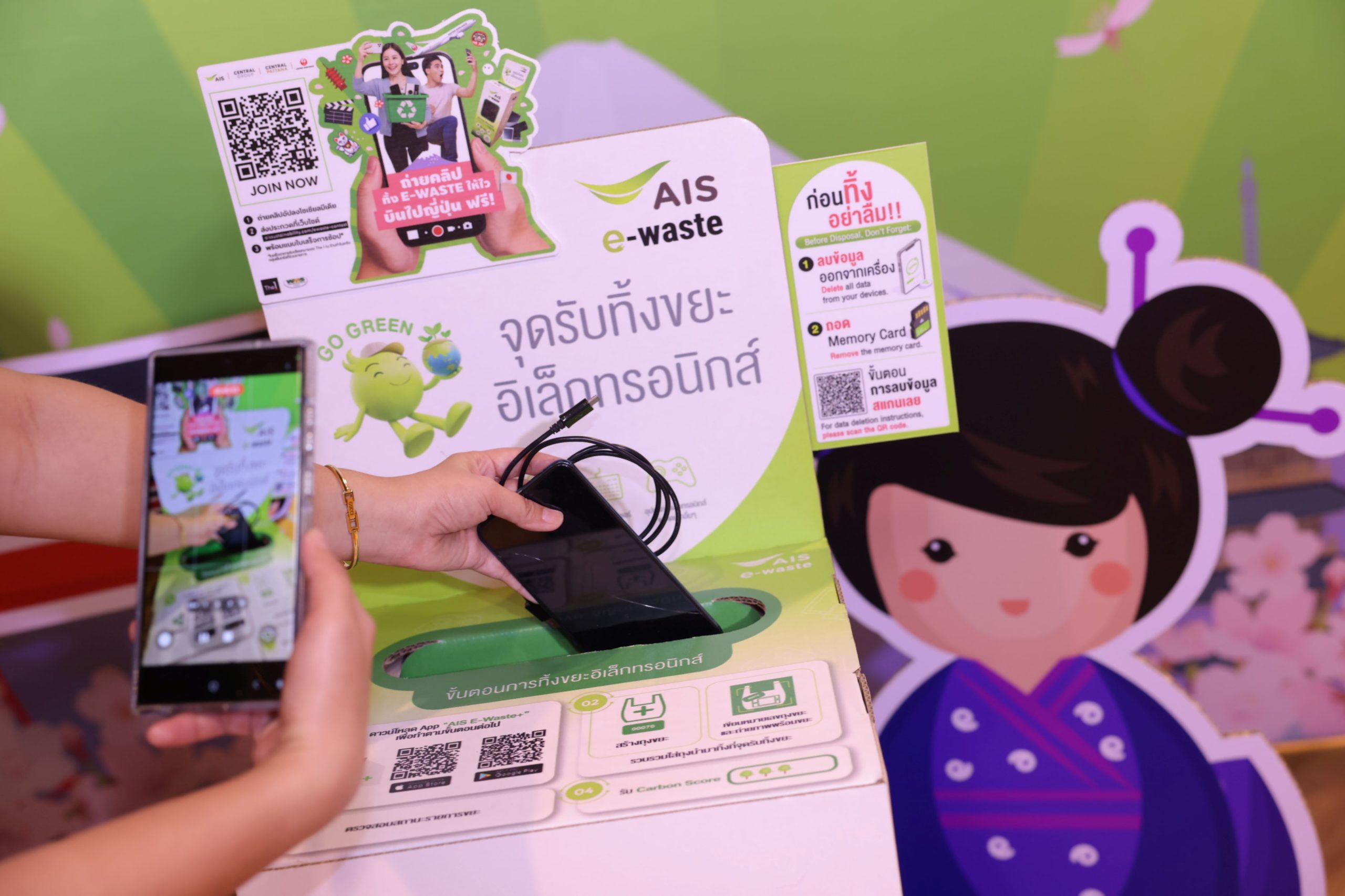 นางสายชล ทรัพย์มากอุดม หัวหน้าหน่วยธุรกิจสื่อสารองค์กรและรัฐกิจสัมพันธ์ AIS กล่าวว่า AIS ผนึกกำลัง กลุ่มเซ็นทรัล และ Japan Airlines (JAL) ร่วมลงมือทำจัดการปัญหาขยะอิเล็กทรอนิกส์ (E-Waste) ส่งแคมเปญ “ถ่ายคลิปทิ้ง E-Waste ให้ไว บินไปญี่ปุ่น ฟรี!” ชวนลูกค้าเอไอเอส และสายช้อป สายกรีน แห่งกลุ่มเซ็นทรัล มาปล่อยพลังไอเดีย สร้างสรรค์คลิปวิดีโอ ท้าเพื่อน ๆ มาทิ้ง E-Waste ให้ถูกที่ ถูกวิธี ลุ้นบินลัดฟ้ากับ Japan Airlines สายการบินแห่งชาติญี่ปุ่น พาไปสัมผัสประสบการณ์ กิน-เที่ยว-ช้อป แบบ All-Inclusive ที่ประเทศญี่ปุ่นฟรี