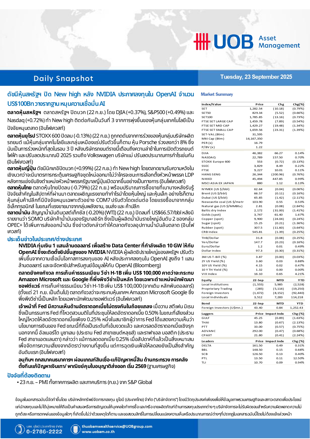 HoonSmart.com>> UOBAM Daily Snapshot : ดัชนีหุ้นสหรัฐฯ ปิด New high หลัง NVIDIA ประกาศลงทุนใน OpenAI จำนวน US$100Bn วางรากฐาน หนุนความเชื่อมั่น AI