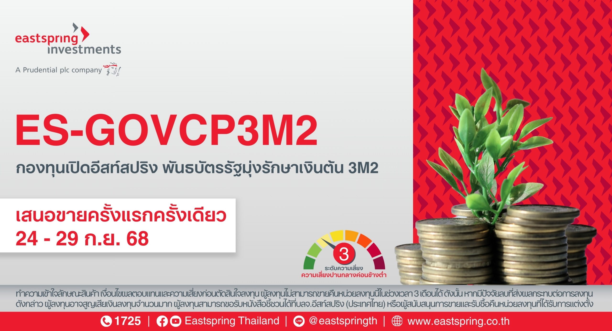 บริษัทหลักทรัพย์จัดการกองทุน (บลจ.) อีสท์สปริง (ประเทศไทย) จำกัด เปิดเสนอขายกองทุนเปิดอีสท์สปริง พันธบัตรรัฐมุ่งรักษาเงินต้น 3M2 (ES-GOVCP3M2) อายุประมาณ 3 เดือน เงินทุนโครงการ 10,000 ล้านบาท ซึ่งเป็นกองทุนรวมตราสารหนี้ที่มุ่งรักษาเงินต้นที่ผู้ลงทุนจะมีโอกาสได้รับเงินต้นคืนเต็มจำนวน และมีโอกาสได้รับผลตอบแทนเพิ่มจากการเพิ่มขึ้นของมูลค่าหน่วยลงทุน ณ วันครบอายุโครงการ โดยเสนอขายครั้งแรกครั้งเดียวตั้งแต่วันที่ 24-29 กันยายน 2568 ด้วยเงินลงทุนขั้นต่ำเพียง 1,000 บาท