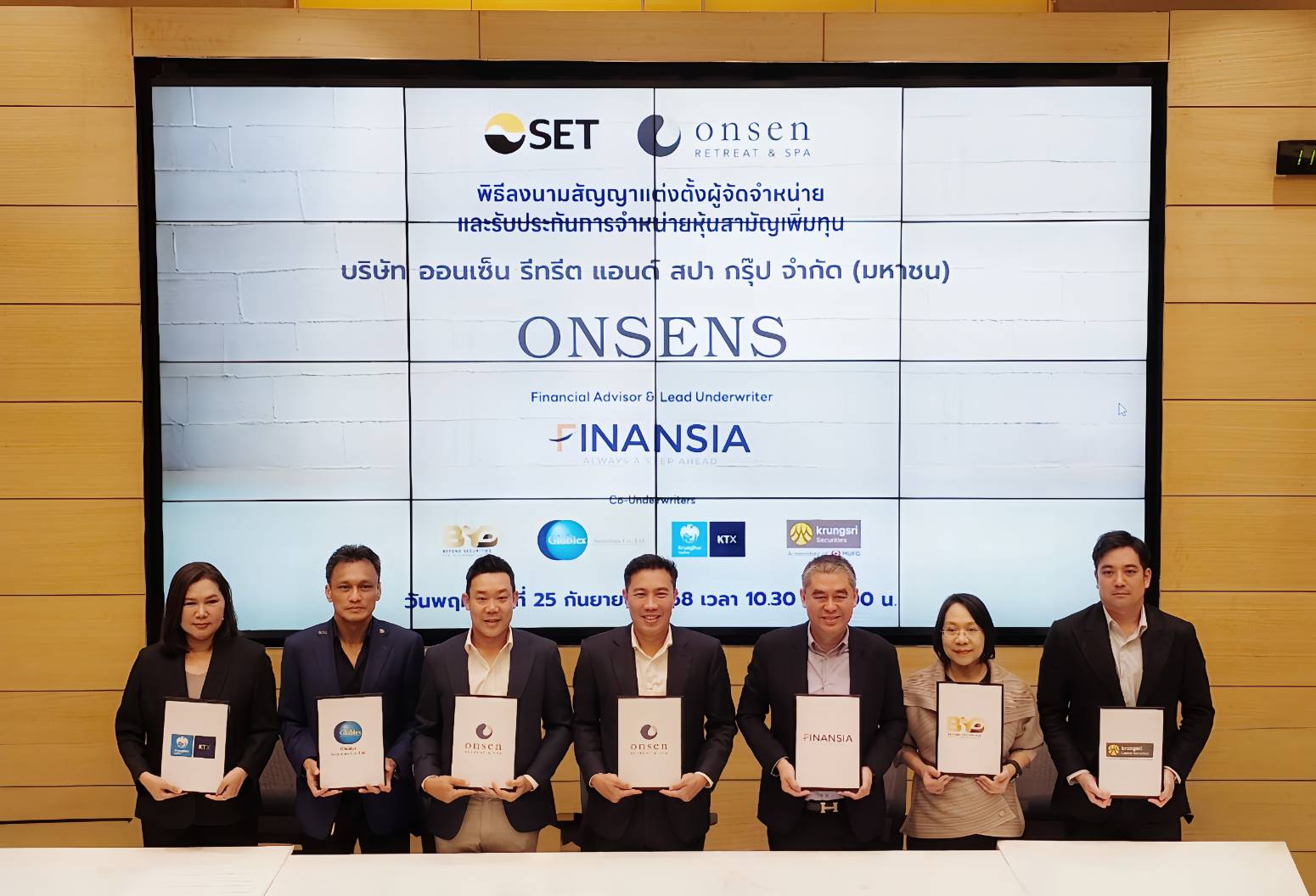วันนี้ (25 ก.ย.) บริษัท ออนเซ็น รีทรีต แอนด์ สปา กรุ๊ป (ONSENS) มีพิธีแต่งตั้ง บริษัทหลักทรัพย์ ฟินันเซียไซรัส เป็นผู้จัดการจำหน่ายและรับประกันการจำหน่ายหุ้นสามัญเพิ่มทุนเสนอขายประชาชนทั่วไปครั้งแรก (IPO) จำนวน 80 ล้านหุ้น หรือ 26.67% ของหุ้นทั้งหมด ราคาเสนอขาย 2.05 บาท/หุ้น มูลค่าที่ตราไว้ (พาร์) 1 บาท เปิดจองซื้อวันที่ 29 -30 ก.ย. และวันที่ 1 ต.ค.นี้ เข้าซื้อขายตลาด SET วันที่ 7 ต.ค. หมวดท่องเที่ยว-สันทนาการ ( TOURISM) ชื่อย่อหุ้น ONSENS