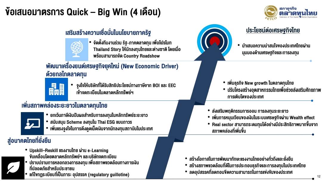 นายกิติพงศ์ อุรพีพัฒนพงศ์ ประธานกรรมการ ตลาดหลักทรัพย์แห่งประเทศไทย กล่าวว่า ข้อเสนอเร่งด่วนเพื่อปรับปรุงกฎหมายตลาดทุนที่สามารถดำเนินการได้ภายใน 4 เดือน และข้อเสนอระยะกลางถึงยาวที่เกี่ยวข้องกับการปรับปรุงกฎหมายและโครงสร้างภาษี ที่อาศัยพระราชกฤษฎีกา ซึ่งไม่ต้องผ่านกระบวนการออกเป็นพระราชบัญญัติ (พรบ.) ทำให้มีโอกาสที่จะผลักดันสำเร็จได้สูง ประกอบด้วย