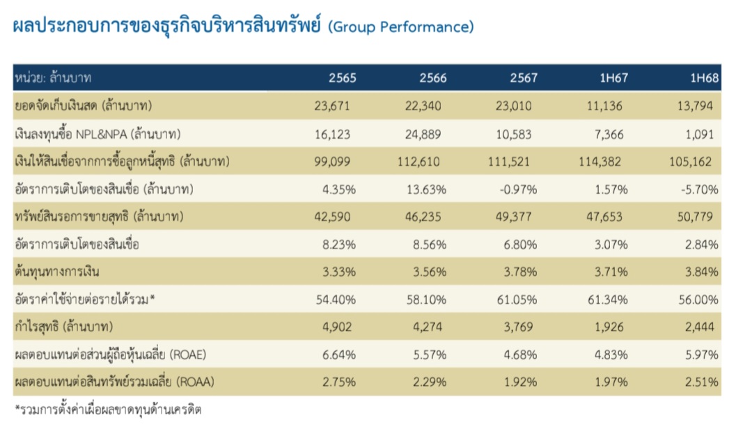 การลงทุนซื้อหนี้และทรัพย์สินใหม่เพื่อนำมาบริหารยังคงชะลอตัวต่อเนื่องจากการปรับลดลงกว่า 58% ในปี 2567 โดยในครึ่งแรกของปี 2568 มีมูลค่าการซื้อหนี้และทรัพย์สินใหม่เพียง 1.1 พันล้านบาท หดตัวกว่า 85% เมื่อเทียบกับช่วงเดียวกันของปีก่อนหน้า