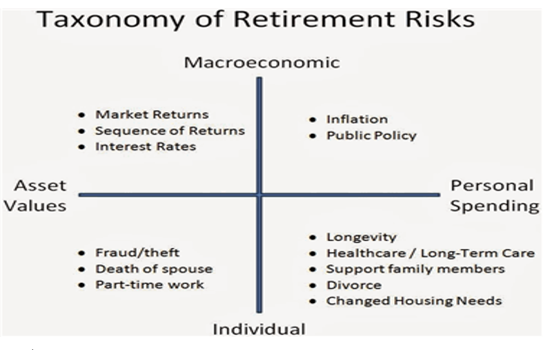 การบริหารเงินเพื่อวัยเกษียณ ก็คล้ายกับการบริหารงบดุลบริษัท คือ บริหารทรัพย์สิน และบริหารหนี้สิน โดยรายได้จากทรัพย์สินจะต้องมากกว่ารายจ่ายตลอดชีวิตเกษียณ ความเสี่ยงด้านการเงินของวัยเกษียณก็คือความเสี่ยงของ 2 ปัจจัยนี้นั่นเอง เราสามารถวิเคราะห์ความเสี่ยงของทรัพย์สิน และหนี้สิน โดยพิจารณาจากปัจจัยที่มีผลกระทบ คือ