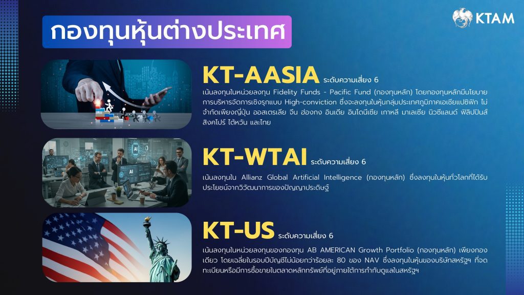 กองทุนเปิดเคแทม เวิลด์ เทคโนโลยี อาร์ทิฟิเชียล อินเทลลิเจนซ์ อิควิตี้ ฟันด์ (KT-WTAI) (ความเสี่ยงระดับ 6) เน้นลงทุนใน Allianz Global Artificial Intelligence (กองทุนหลัก) ซึ่งเน้นลงทุนในหุ้นทั่วโลกที่ได้รับประโยชน์จากวิวัฒนาการของปัญญาประดิษฐ์ ปัจจุบันพอร์ตกองทุนหลักประกอบด้วยหุ้นผู้นำเทคโนโลยี เช่น NVIDIA, Microsoft, Broadcom, Meta และ TSMC ที่เป็นศูนย์กลางของเมกะเทรนด์ AI ในปัจจุบัน (ที่มา: Factsheet ของกองทุนรวมหลัก ณ 31 ก.ค. 2568 ผู้จัดการกองทุนหลักอาจมีการเปลี่ยนแปลงหลักทรัพย์ที่ลงทุนตามดุลยพินิจ) โดยลักษณะที่ทำให้กองทุนนี้โดดเด่น คือการไม่จำกัดการลงทุนเฉพาะ Cloud, Data Center หรือ Semiconductor เท่านั้น แต่ยังเปิดกว้างไปยังอุตสาหกรรมที่สามารถใช้ AI มาสร้างมูลค่าเพิ่ม ซึ่งจะได้รับประโยชน์จากการนำ AI มาปรับปรุงกระบวนการ วิเคราะห์ข้อมูล และเพิ่มประสิทธิภาพการดำเนินงาน สำหรับนักลงทุนระยะยาว กองทุนนี้จึงไม่ใช่เพียง “Pure tech play” แต่เป็นวิธีการลงทุนที่จับธีม AI ในเชิงโครงสร้างได้อย่างครอบคลุมและสมดุลมากกว่า