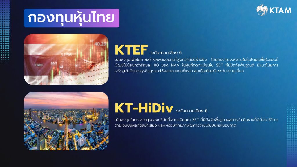 กองทุนเปิดกรุงไทย หุ้นไฮดิวิเดนด์ (KT-HiDiv) (ความเสี่ยงระดับ 6) เน้นลงทุนในตราสารทุนของบริษัทที่จดทะเบียนใน SET ที่มีปัจจัยพื้นฐานผลการดำเนินงานที่ดี มีประวัติการจ่ายเงินปันผลที่ดีสม่ำเสมอ และ/หรือมีศักยภาพในการจ่ายเงินปันผลในอนาคต นอกจากนี้ กองทุน KT-HiDiv-D และ KT-HiDiv RMF ยังได้รับรางวัลกองทุนยอดเยี่ยมจาก Morningstar Awards for Investing Excellence ในกลุ่มกองทุนหุ้นขนาดใหญ่มา 2 ปีติดต่อกัน คือ ปี 2567 และปี 2568