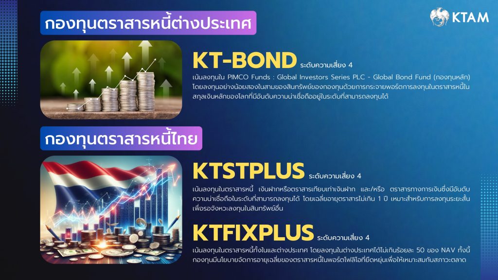 กองทุนเปิดกรุงไทยตราสารหนี้ระยะสั้นพลัส (KTSTPLUS) (ความเสี่ยงระดับ 4) เน้นลงทุนในตราสารหนี้ เงินฝากหรือตราสารเทียบเท่าเงินฝาก และ/หรือตราสารทางการเงินซึ่งมีอันดับความน่าเชื่อถือในระดับที่สามารถลงทุนได้ โดยเฉลี่ยอายุตราสารไม่เกิน 1 ปี เหมาะสำหรับการลงทุนระยะสั้นเพื่อรอจังหวะลงทุนในสินทรัพย์อื่น และกองทุนเปิดกรุงไทยตราสารหนี้ พลัส (KTFIXPLUS) (ความเสี่ยงระดับ 4) เน้นลงทุนในตราสารหนี้ทั้งในและต่างประเทศ โดยลงทุนในต่างประเทศได้ไม่เกินร้อยละ 50 ของ NAV ทั้งนี้ กองทุนมีนโยบายจัดการอายุเฉลี่ยของตราสารหนี้ในพอร์ตโฟลิโอที่ยืดหยุ่นเพื่อให้เหมาะสมกับสภาวะตลาด