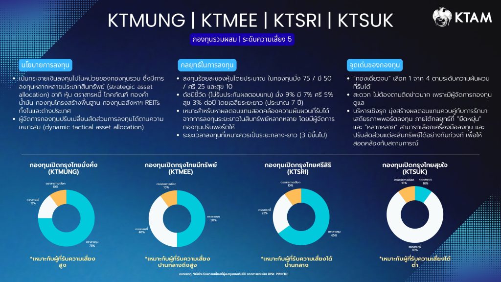 นอกจากนี้ สำหรับนักลงทุนที่ต้องการกระจายความเสี่ยง การลงทุนในกองทุนที่มีการลงทุนในสินทรัพย์ที่หลากหลาย ก็อาจเป็นอีกทางเลือกหนึ่งภายใต้สถานการณ์ความผันผวนในปัจจุบัน โดย บลจ.กรุงไทย แนะนำ กลุ่มกองทุน KTMUNG, KTMEE, KTSRI และ KTSUK (ความเสี่ยงระดับ 5) ซึ่งเน้นการลงทุนโดยการจัดสรรเงินลงทุนในหลายสินทรัพย์ทั่วโลก โดยลงทุนแบบ Fund of Funds ภายใต้บริษัทจัดการกองทุน และจะลงทุนในกองทุนใดกองทุนหนึ่งไม่เกินร้อยละ 79 ของ NAV มีทั้งหมด 4 กองแบ่งตามระดับความเสี่ยงที่นักลงทุนยอมรับได้ (ไม่ใช่ระดับความเสี่ยงตามผลประเมิน Suitability Test)