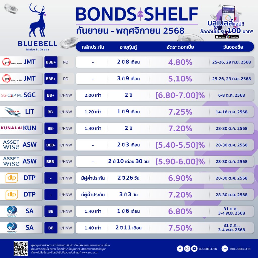 บริษัทหลักทรัพย์ บลูเบลล์ เปิดเสนอขายหุ้นกู้ใหม่ เดือนต.ค.-พ.ย.2568 จำนวน 9 บริษัท ได้แก่ หุ้นกู้บริษัท เอสจี แคปปิตอล (SGC) อายุ 2 ปี คาดดอกเบี้ย 6.80-7.00% ต่อปี เปิดขาย IPO ให้แก่นักลงทุนสถาบันและนักลงทุนรายใหญ่ (II/HNW) ตั้งแต่วันที่ 6-8 ต.ค.2568 อันดับเครดิตหุ้นกู้ BB+ และมีหลักประกัน 2.00 เท่า