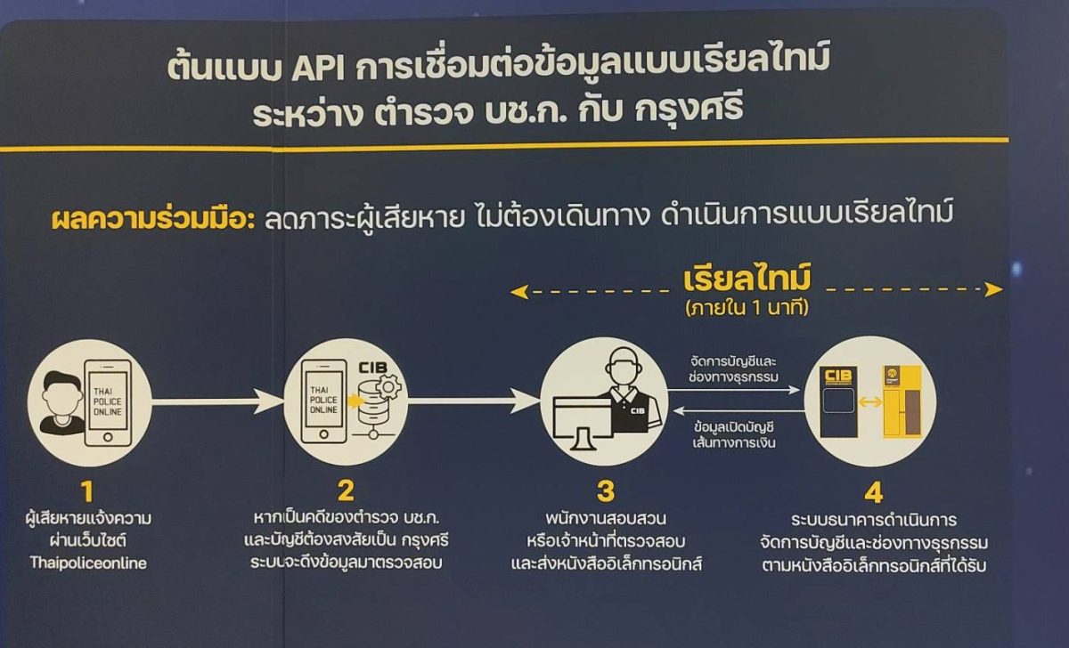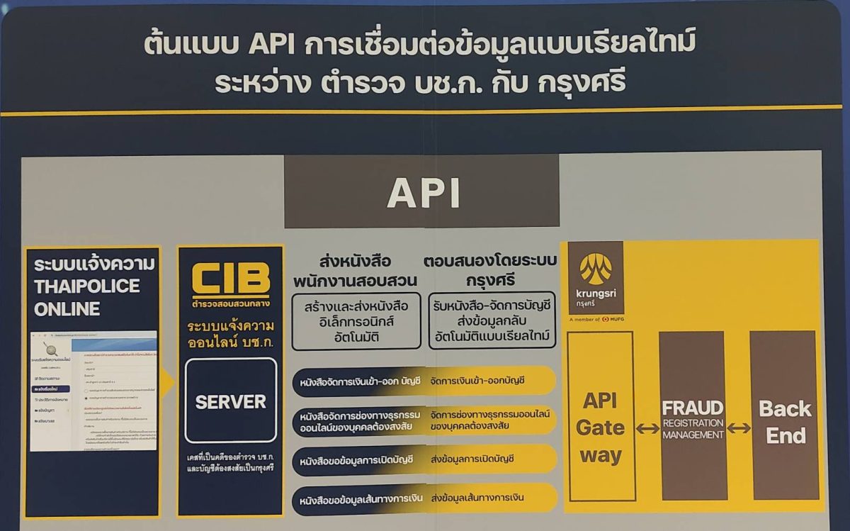 พลตำรวจตรี ณัฐศักดิ์ เชาวนาศัย รองผู้บัญชาการตำรวจสอบสวนกลาง กองบัญชาการตำรวจสอบสวนกลาง (บช.ก.) กล่าวว่า ได้ร่วมกันทำงานกับธนาคารกรุงศรีอยุธยา ตั้งแต่เดือนพ.ย.2567 เพื่อทำระบบนำร่องการป้องกันและปราบปรามอาชญากรรมทางเทคโนโลยี ที่ทำงานได้จริงอย่างเป็นรูปธรรม ซึ่งได้ร่วมกันพิจารณามาอย่างรอบด้าน ทั้งด้านกฎหมาย กระบวนการทำงาน เทคโนโลยีที่เกี่ยวข้อง โดยเฉพาะการทำให้ข้อมูลดิจิทัล และพยานหลักฐานที่เกี่ยวข้องในการนำไปสู่การสืบสวนสอบสวนได้จริง ควบคู่กับกับการปรับวิธีการทำงานของพนักงานสอบสวนและเจ้าหน้าที่ที่เกี่ยวข้อง ไปสู่ระบบอิเล็คทรอนิคส์ผ่านระบบ API ภายใต้กฎหมายและหลักเกณฑ์ที่ตกลงร่วมกัน ผ่านช่องทางที่ได้รับการคุ้มครองด้านความปลอดภัยและมีหน่วยงานที่เกี่ยวข้องกำกับดูแลอย่างเคร่งครัด