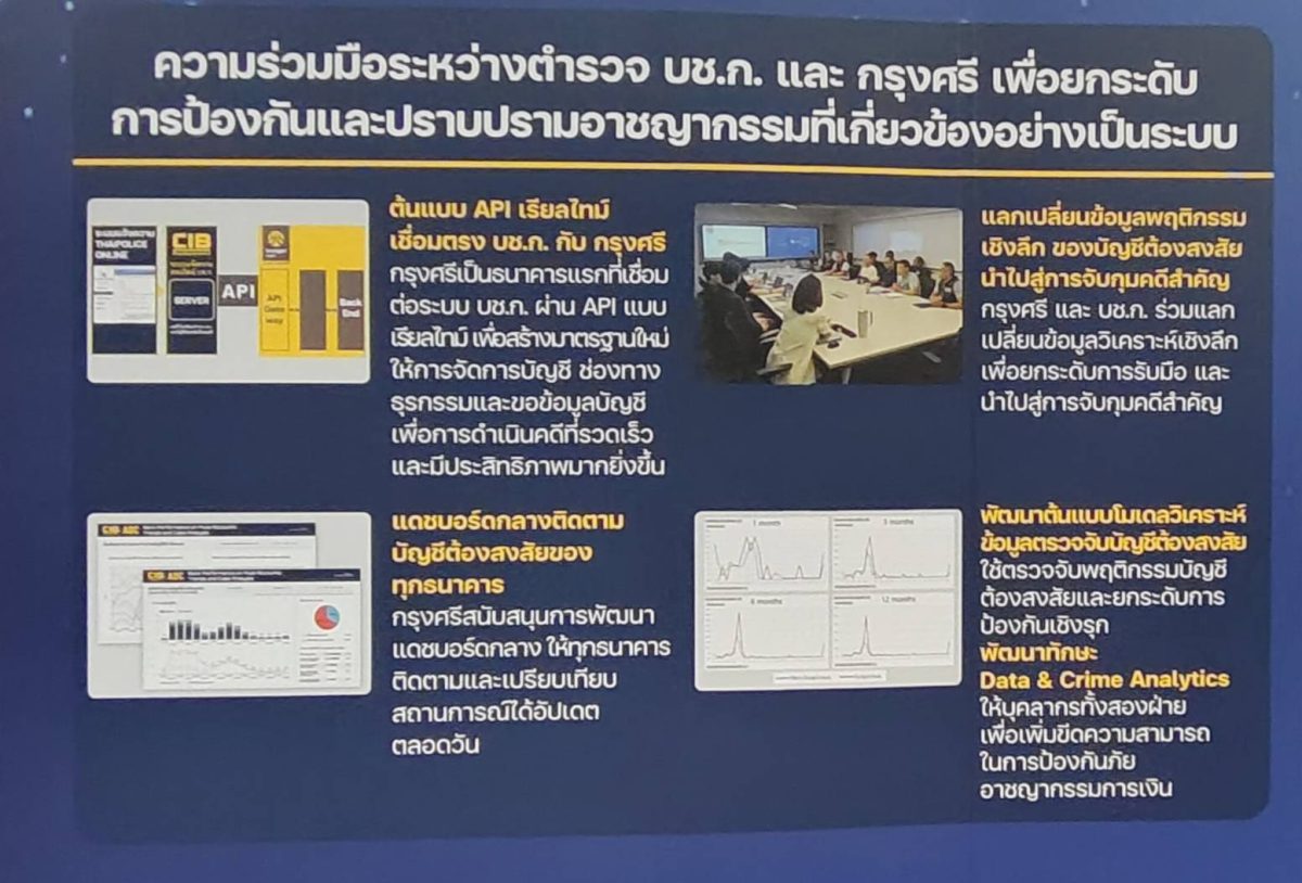 ธนาคารกรุงศรีอยุธยา เป็นแบงก์แรกที่มีการเชื่อมต่อระบบตรงกับบช.ก. ผ่าน API แบบเรียลไทม์ เป็นการสร้างมาตรฐานใหม่ในการจัดการบัญชี ช่องทางธุรกรรม และข้อมูลบัญชี เพื่อดำเนินการที่รวดเร็ว มีการจัดทำแดชบอร์ดกลาง ติดตามบัญชีต้องสงสัยของทุกธนาคาร แลกเปลี่ยนข้อมูลพฤติกรรมเชิงลึกของบัญชีต้องสงสัย นำไปสู่การจับกุมคดีสำคัญ พัฒนาต้นแบบโมเดลวิเคราะห์บัญชีต้องสงสัย และพัฒนาทักษะ Data&Crime Analytics เพื่อเพิ่มขีดความสามารถของบุคลากร