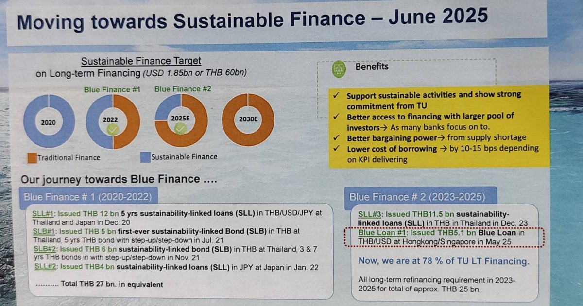 นายธีรพงศ์ กล่าวว่า ธุรกรรมล่าสุดในเดือนก.ย.มีมูลค่ารวม 19,000 ล้านบาท แบ่งเป็นสินเชื่อ SLL จำนวน 10,000 ล้านบาท และหุ้นกู้จำนวน 9,000 ล้านบาท จากกลุ่มพันธมิตร 8 สถาบันการเงินชั้นนำ นับเป็นครั้งแรกในประเทศไทยที่มีการออกหุ้นกู้แบบผสมผสานระหว่าง หุ้นกู้ Blue Bond มุ่งเน้นการจัดสรรเงินทุนโดยตรงไปยังโครงการอนุรักษ์ทรัพยากรทางทะเลและส่งเสริมเศรษฐกิจสีน้ำเงิน และหุ้นกู้ SLB ได้รับความต้องการที่ล้นหลามจากนักลงทุน ส่งผลให้ยอดจองหุ้นกู้สูงเกินกว่ายอดเสนอขาย ทำให้ไทยยูเนี่ยนสามารถกำหนดอัตราดอกเบี้ยในระดับต่ำสุดของช่วงเสนอขายในทุกช่วงอายุของหุ้นกู้ ซึ่งถือเป็นอัตราดอกเบี้ยในระดับต่ำสุดเป็นประวัติการณ์ของบริษัท สะท้อนความเชื่อมั่นของตลาดต่อสถานะทางการเงินและวิสัยทัศน์ด้านความยั่งยืนของบริษัท
