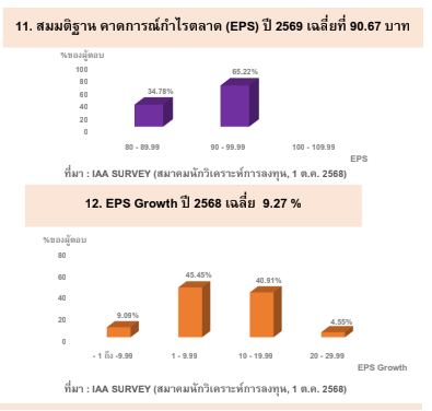 สำหรับ การคาดการณ์กำไรสุทธิต่อหุ้น (EPS) ของตลาดในปี 2568 อยู่ที่เฉลี่ย 85.14 บาทต่อหุ้น ใกล้เคียงกับผลสำรวจครั้งก่อนที่อยู่ที่ 85.43 บาทต่อหุ้น โดยคาดว่าอัตราการเติบโตของ EPS ในปีนี้จะเฉลี่ยอยู่ที่ 9.27% และในปี 2569 คาดว่า EPS เฉลี่ยจะเพิ่มขึ้นเป็น 90.67 บาทต่อหุ้น