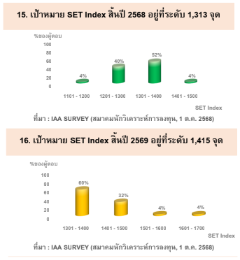 ขณะที่ดัชนี SET Index ในไตรมาส 4 ปี 2568 คาดว่าจะเคลื่อนไหวในกรอบ 1,234 ถึง 1,356 จุด และจะปิดสิ้นปีที่ระดับ 1,313 จุด ก่อนจะขยับขึ้นไปแตะ 1,415 จุด ณ สิ้นปี 256