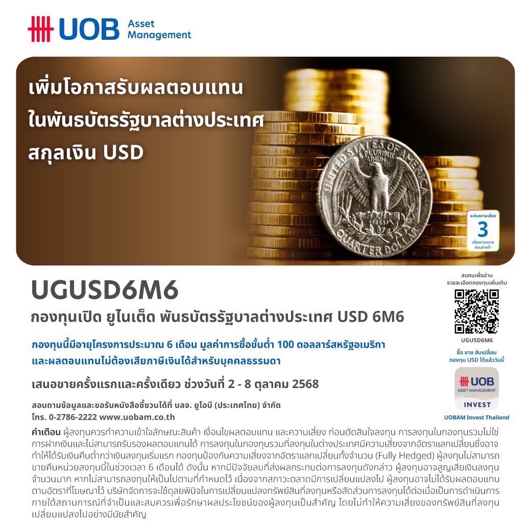บริษัทหลักทรัพย์จัดการกองทุน (บลจ.) ยูโอบี (ประเทศไทย) จำกัด หรือ UOBAM เปิดให้บริการลงทุนในกองทุนสกุลเงินดอลลาร์สหรัฐฯ (USD) ผ่านแอปพลิเคชัน UOBAM Invest Thailand เวอร์ชันใหม่ โดยผู้ลงทุนสามารถทำรายการ ซื้อ ขาย และสับเปลี่ยนกองทุน ได้อย่างสะดวกสบายในแอปพลิเคชันเดียว พร้อมกันนี้ บลจ.ยูโอบี ได้เสนอขายหน่วยลงทุนครั้งแรก (IPO) กองทุนเปิด ยูไนเต็ด พันธบัตรรัฐบาลต่างประเทศ USD 6M6 (UGUSD6M6) อายุประมาณ 6 เดือน มีประมาณการผลตอบแทน 3.60% ต่อปี (ข้อมูลจากอัตราผลตอบแทนที่เสนอโดยผู้ออกตราสาร หรือจากผู้ขาย ณ วันที่ 29 กันยายน 2568) กองทุนมีขนาดโครงการ 200 ล้านดอลลาร์สหรัฐ โดยเสนอขายในราคา 10 ดอลลาร์สหรัฐต่อหน่วย และยอดลงทุนครั้งแรกขั้นต่ำ 100 ดอลลาร์สหรัฐ