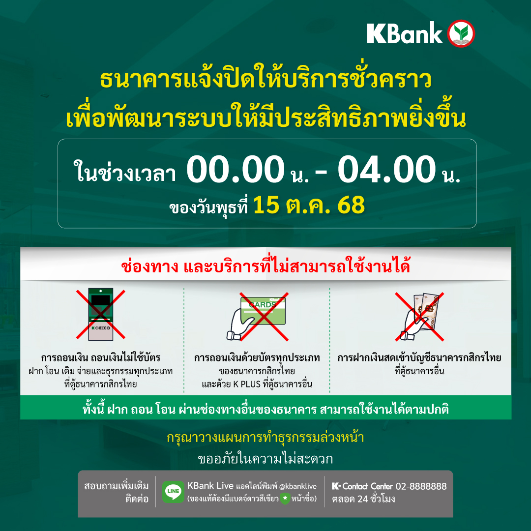 ธนาคารกสิกรไทย แจ้งปิดให้บริการชั่วคราว เป็นเวลา 4 ชั่วโมง เพื่อพัฒนาระบบให้มีประสิทธิภาพยิ่งขึ้น ในวันพุธที่ 15 ตุลาคม 2568 เวลา 00.00-04.00 น. โดยช่องทางและบริการที่ไม่สามารถใช้งานได้ ดังนี้