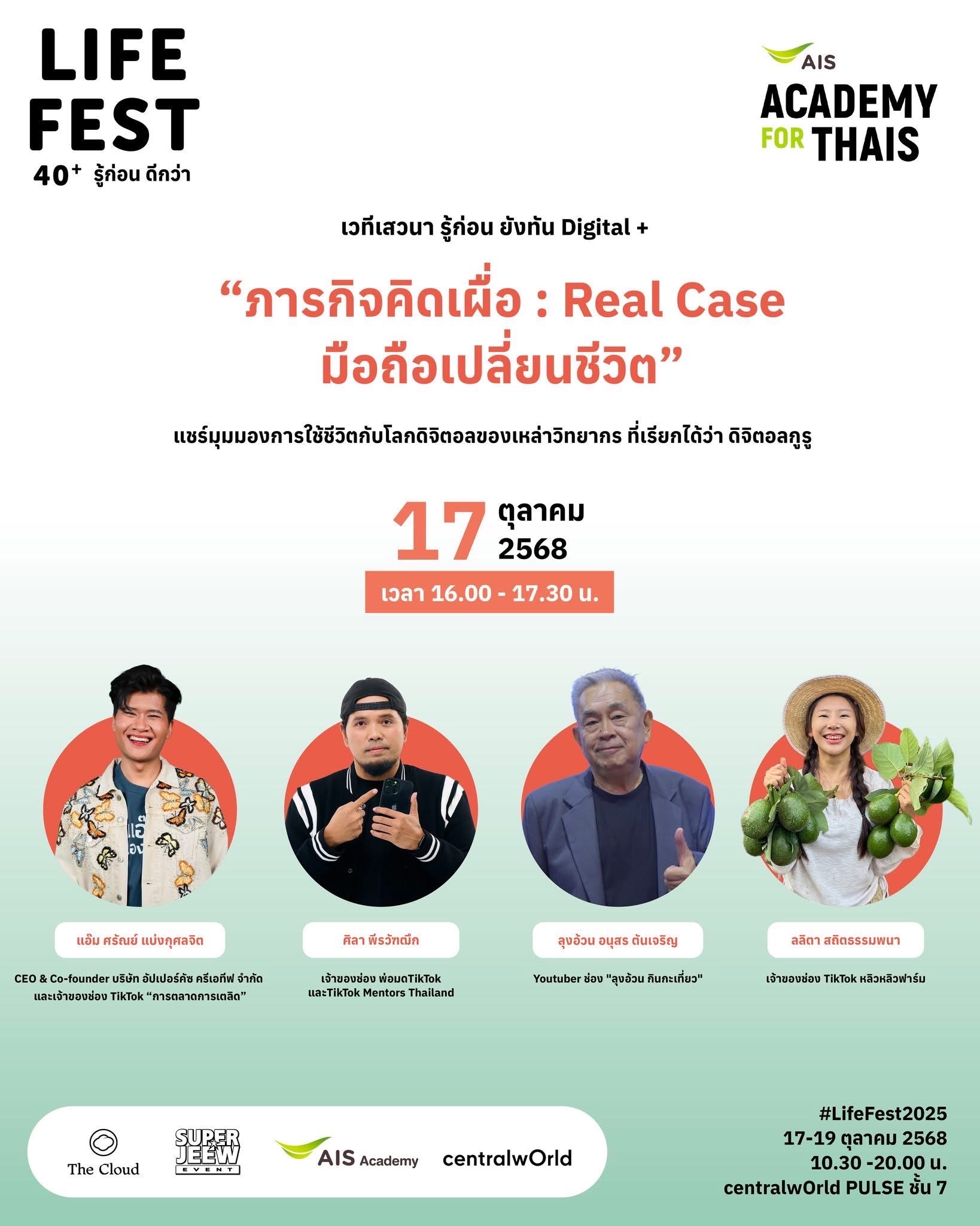 HoonSmart.com >>เคลียร์คิวให้พร้อม! ปลดล็อกโอกาสใหม่ ในงาน “AIS ACADEMY for THAIs : LIFE FEST 40+” ปลุกพลังการเรียนรู้ จากกูรูแถวหน้าของเมืองไทย ยกระดับคุณภาพชีวิตคนไทยสู่วัยอิสระที่ยั่งยืน วันศุกร์ 17 ต.ค.นี้ เวลา 10.00 – 20.00 น. ณ centralwOrld PULSE ชั้น 7