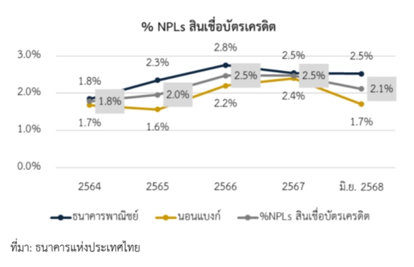 ขณะเดียวกัน ธปท. ยังคงเดินหน้ามาตรการช่วยเหลือลูกหนี้รายย่อย เช่น โครงการ “คุณสู้เราช่วย” เฟส 2 ซึ่งครอบคลุมกลุ่มสินเชื่อบัตรเครดิตและสินเชื่อส่วนบุคคล ถือเป็นแรงสนับสนุนสำคัญที่ช่วยลดแรงกดดันต่อคุณภาพพอร์ตในระยะสั้น อย่างไรก็ดี แนวโน้มการฟื้นตัวของคุณภาพสินทรัพย์ยังต้องติดตามภาวะเศรษฐกิจโดยรวมและความสามารถในการชำระหนี้ของครัวเรือน ซึ่งยังเปราะบางจากระดับหนี้ที่สูงและการฟื้นตัวทางรายได้ที่ไม่สม่ำเสมอ
