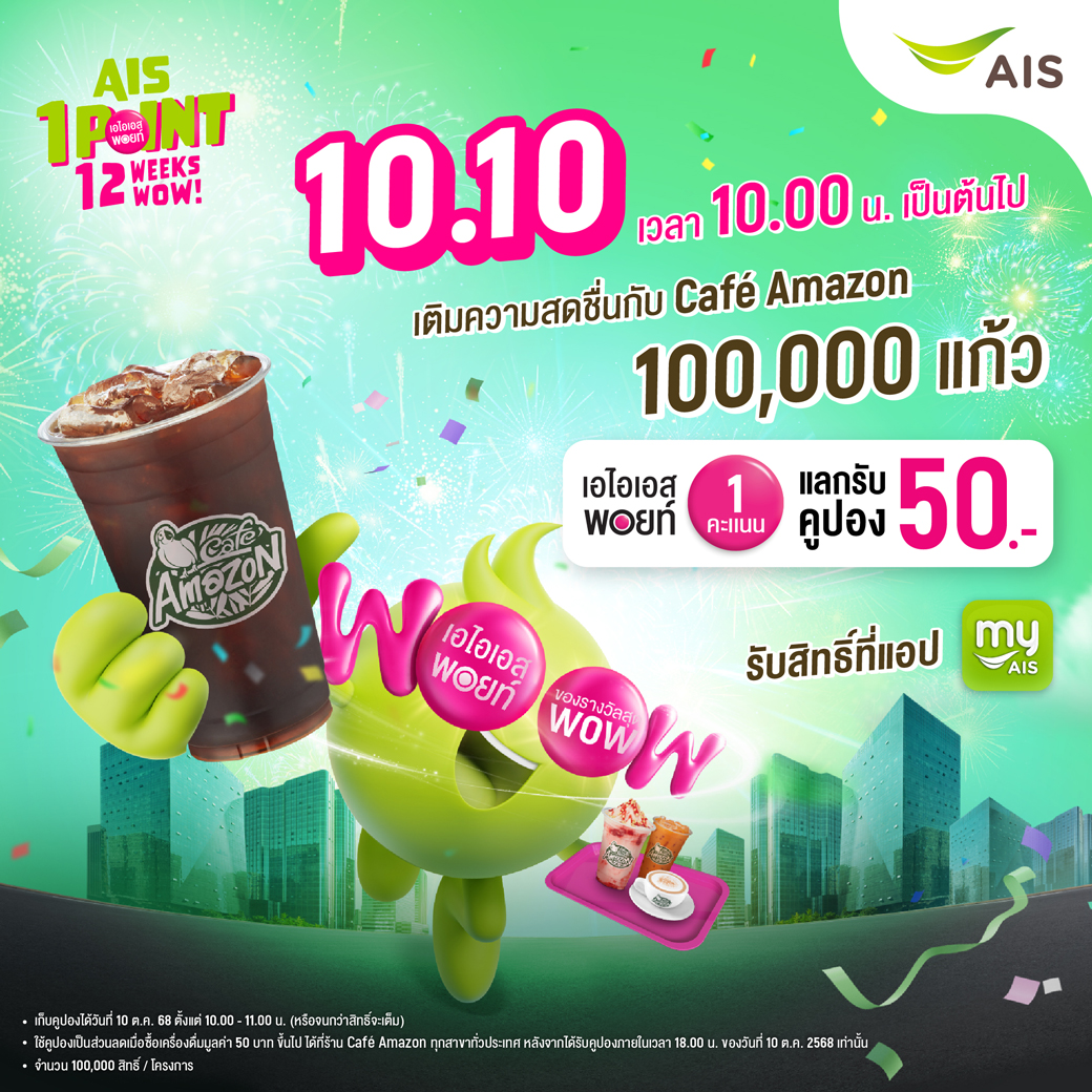 เอไอเอสตั้งใจมอบทุกเซอร์ไพรส์ความ WOW ให้ลูกค้าต่อเนื่องตลอดทั้งแคมเปญ และในวันที่ 10 ตุลาคม 2568 นี้ ขอมอบของขวัญความ WOW ครั้งใหญ่ ให้ลูกค้าใช้ AIS Points 1 คะแนน แลกรับฟรี! คูปองส่วนลดเครื่องดื่ม Café Amazon มูลค่า 50 บาท ได้เลยทันที วันเดียวเท่านั้น! ผ่านแอป myAIS ตั้งแต่เวลา 10.00 น. – 11.00 น. (หรือจนกว่าสิทธิ์จะเต็ม)