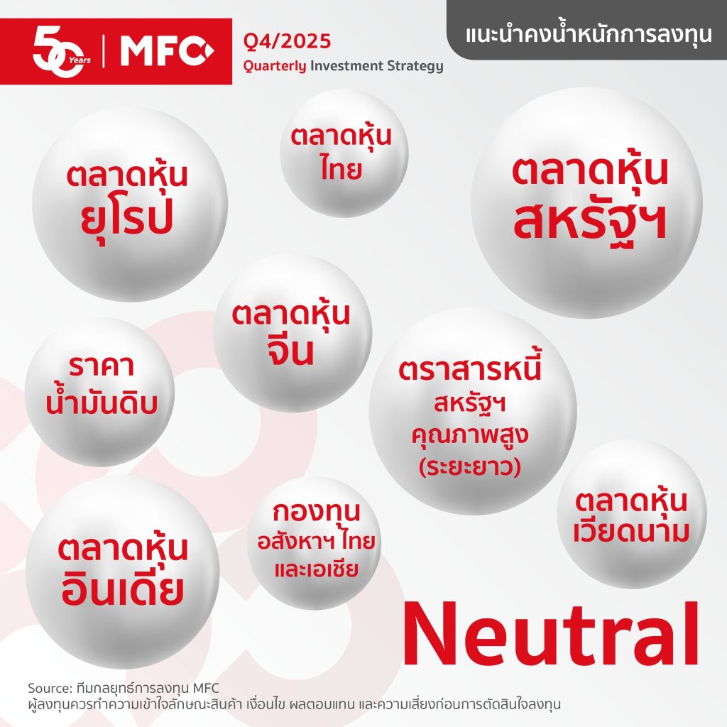 HoonSmart.com>>บลจ.เอ็มเอฟซี (MFC) แนะจัดพอร์ตลงทุนไตรมาส 4/68 เพิ่มน้ำหนัก “ตราสารหนี้ไทยและต่างประเทศ-ทองคำ-กองทุนอสังหาริมทรัพย์ทั่วโลก” รับแนวโน้มดอกเบี้ยขาลง พร้อมลดน้ำหนักหุ้นอินเดีย จาก “Overweight” เป็น “Neutral” ระดับราคาสูง เช่นเดียวกับ “หุ้นสหรัฐฯ-ยุโรป-จีน” ให้น้ำหนัก “Neutral” พร้อมคัด 10 กองทุนเด่นแนะนำลงทุน