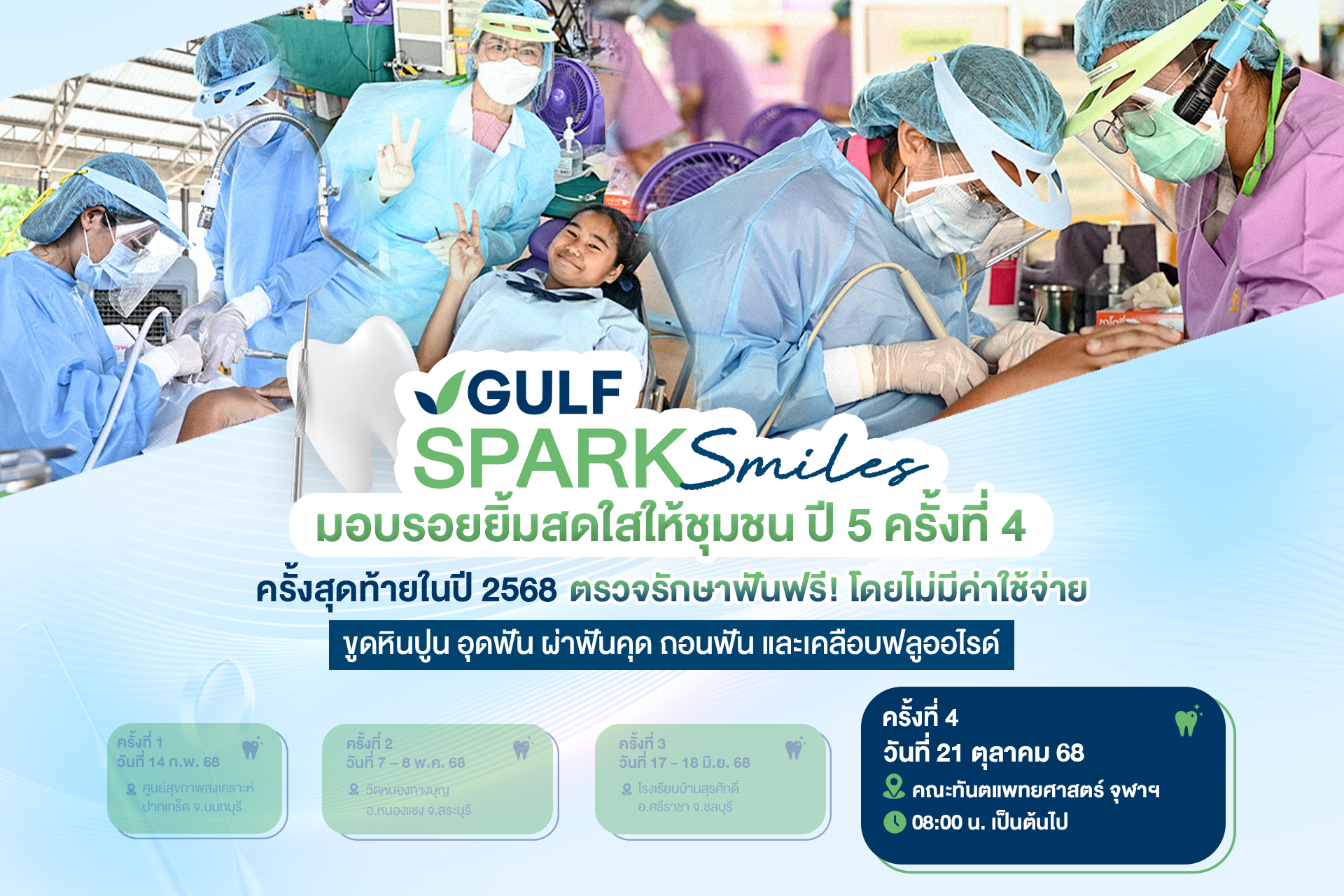 การออกหน่วยทันตกรรมเคลื่อนที่ของโครงการ ‘GULF Sparks Smiles มอบรอยยิ้มสดใสให้ชุมชน’ ในครั้งนี้ เป็นการออกหน่วยครั้งสุดท้ายของปี ซึ่งจะให้บริการทำฟันฟรีในเบื้องต้น อาทิ อุดฟัน ถอนฟัน ขูดหินปูน เคลือบฟลูออไรด์ เอกซเรย์ และผ่าฟันคุด โดยผู้ที่สนใจเข้ารับบริการสามารถ walk-in มารับบัตรคิว และลงทะเบียนได้ที่หน้าอาคารบรมนาถศรีนครินทร์ คณะทันตแพทยศาสตร์ จุฬาลงกรณ์มหาวิทยาลัย โดยจะเริ่มแจกบัตรคิวตั้งแต่เวลา 06.00 น. (รับจำนวนจำกัด)